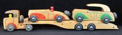 | Description | Holgate #638 Auto Convoy Trailer, as pictured in the 1941 catalog. With metal steering wheel and other metal button "details". Cab has gold pre-"MADE IN U.S.A." decals (dt4b). With two people. Chains missing from trailer. All three vehicles have an extra button (like the headlights) as a bumper in the front. |