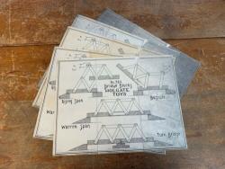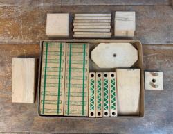 | Description | Set of green-painted wooden blocks, with paper instructions for building several types of bridges. Appears complete, with 18 beams 8 pegs 2 ramps 2 roads 1 large octagonal base with hole (should have peg?) 1 small base with 2 pegs and a hole 1 large flat square (should there be 2?) 2 small flat squares Two piece manila box (card top, corrugated bottom), with blued-steel reinforced corners. Some water damage to box top. See Holgate #784 "Bridge Blocks" in box, incomplete for another example. |