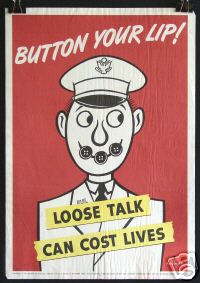 "BUTTON YOUR LIP!" "LOOSE TALK CAN COST LIVES". "DISTRIBUTED IN THE INTEREST OF NATIONAL DEFENSE, AND AS A MEANS OF OBTAINING FUNDS FOR AMBULANCES WHEREVER NEEDED. BRITISH AND AMERICAN AMBULANCE CORPS, INC., 420 LEXINGTON AVENUE, NEW YORK CITY". Artist's signature "O.SOGLOW" under an 'a' over 'ART', with the top of the 'a' looking like an eagle's head. (C) 1942. |