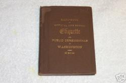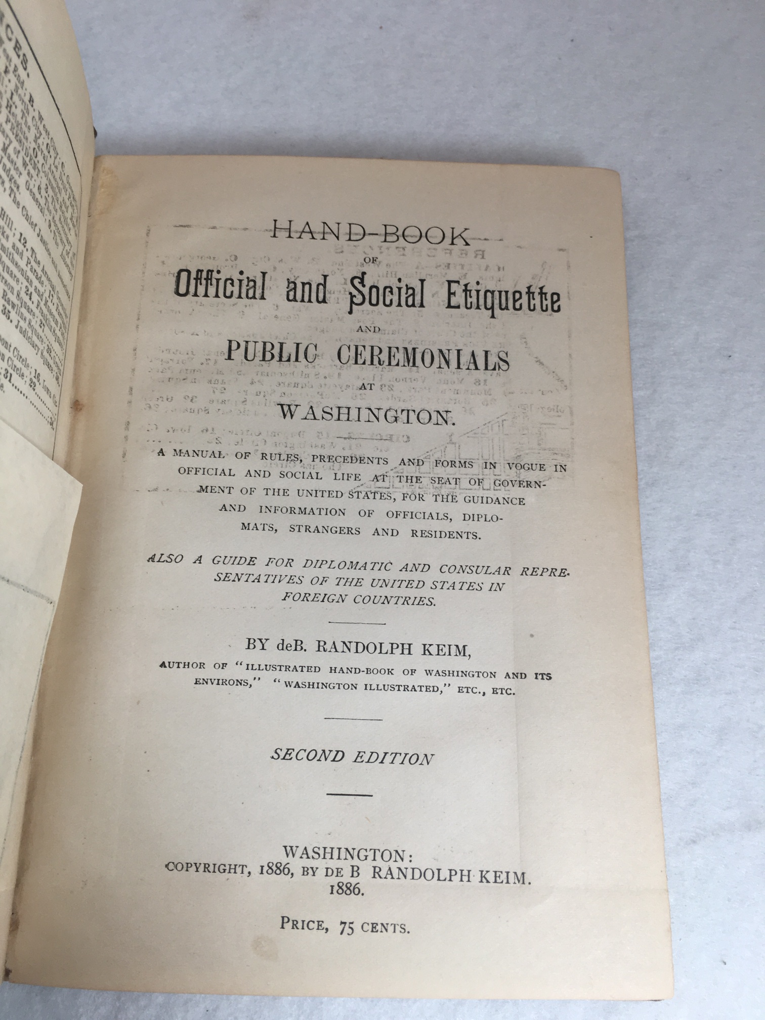 "A manual of rules, precedents and forms in vogue in official and social life at the seat of government of the United States, for the guidance and information of officials, diplomats, strangers and residents." By deB. Randolph Keim. Second Edition, "Washington: Copyright, 1886, by de B Randolph Keim. 1886 Price, 75 cents". Brown pressed cloth hardback with gilt. 231 pages. Fold-out map of "Washington City" bound at front. Owner's signature, "William Zuniby(?)" |