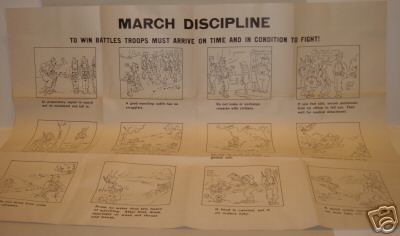 "March Discipline", "To win battles troops must arrive on time and in condition to fight!" Black on white, unmarked.