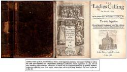 "2 famous works of Stuart period on how to behave. Each separately published. Gentleman's Calling 1st edition was 1660. Extra engraved title. On gentlemen. advantages of education, wealth, reputation, etc. 2pp. with old marg. doodling. Ladies Calling is 3rd edition. 1st edition was 1673. Extra engraved title. On modesty, meekness, compassion, affability, piety, wives, virgins, widows. 2pp. with bit of old marg. doodling. Calf worn. no free eps. or flys. Gd."