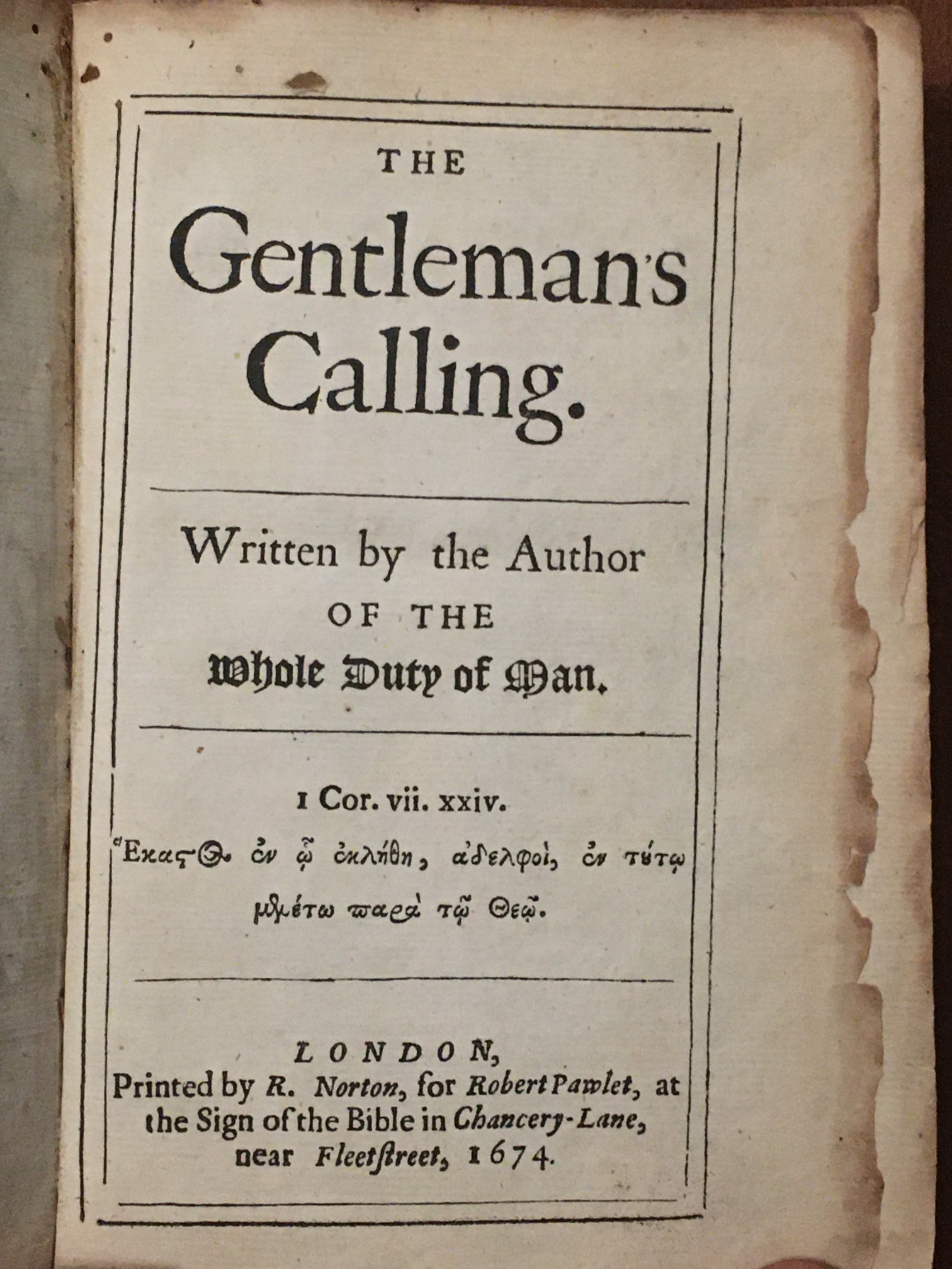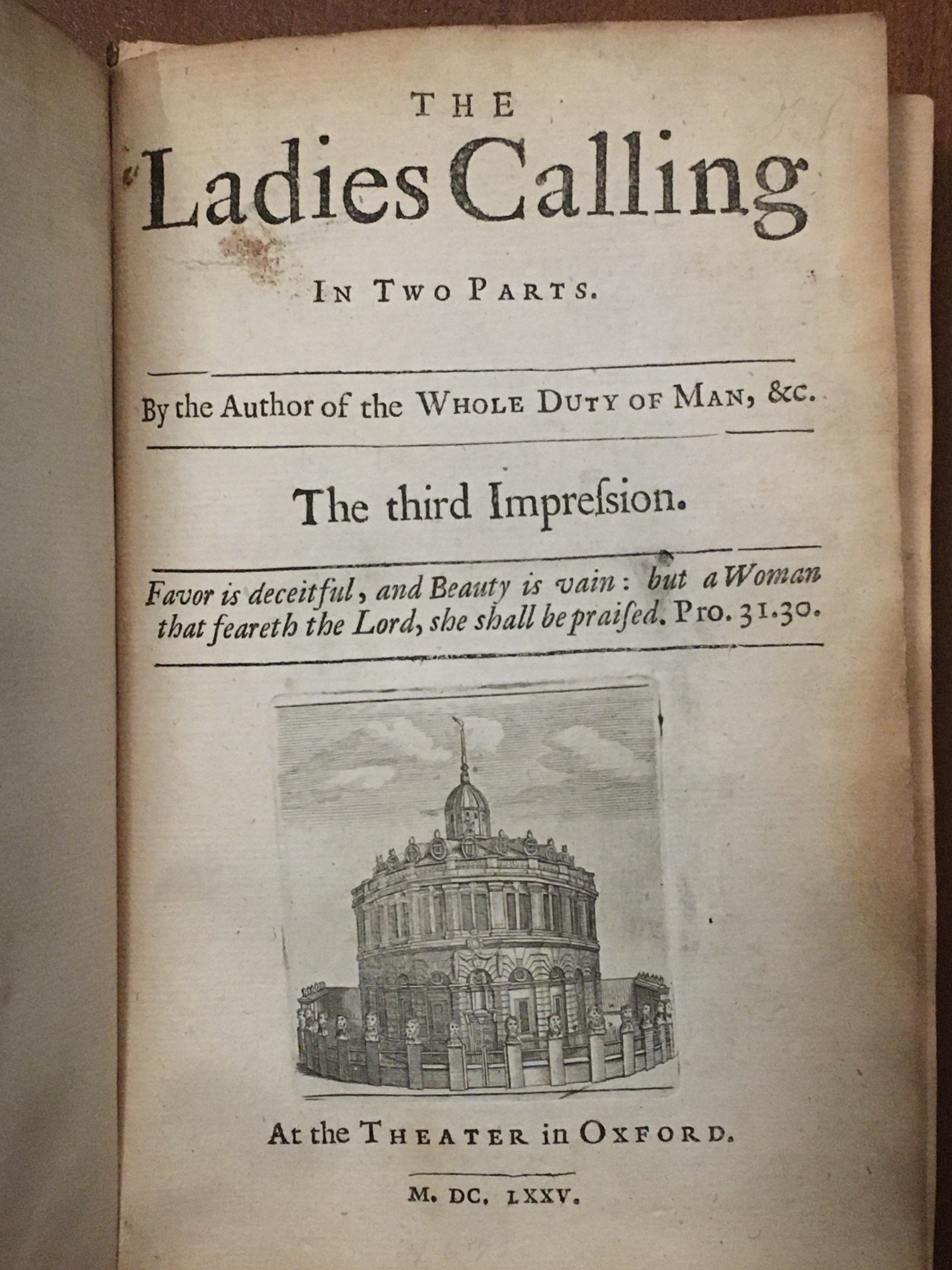 Two books, "The Gentlemans Calling" (London, 1674) and "The Ladies Calling" (Oxford, 1675), both by "the Author of the Whole Duty of Man". Bound together. Spine cracked, small glue repair to part of spine.
