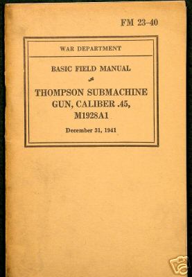 "BASIC FIELD MANUAL THOMPSON SUBMACHINE GUN, CALIBER .45 M1928A1". Smaller size booklet which never had a second (bottom) staple. Includes 13 page (unstapled) change "C 1", stamped "MAY 1 1944", which supercedes Chapter 1 Section III on "Care and Cleaning". |