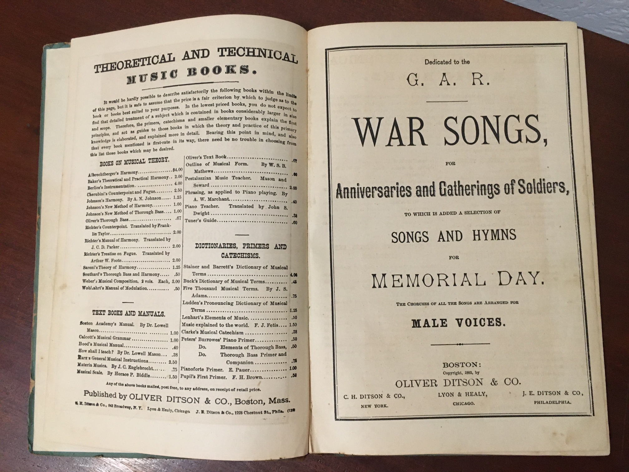 "Dedicated to the G.A.R. War Songs, for Anniversaries and Gatherings of Soldiers, to which is added a selection of Snogs and Hymns for Memorial Day. The Choruses of all the Songs are Arranged for Male Voices."