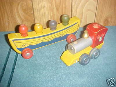 Wooden boat with four different colored cylindrical "people" riding in holes in the top.Yellow boat with blue detail, waves and fish, marked "HOLGATE" on the bow. Red wheels and a hole for a pull-string.