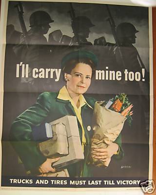 OWI Poster No 28, a woman with packages and groceries. "I'll carry mine too!", "TRUCKS AND TIRES MUST LAST TILL VICTORY".