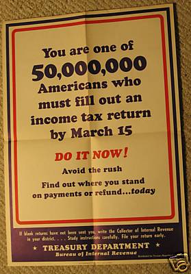 "You are one of 50,000,000 Americans who must fill out an income tax return by March 15 DO IT NOW! Avoid the rush Find out where you stand on payments or refund...today"