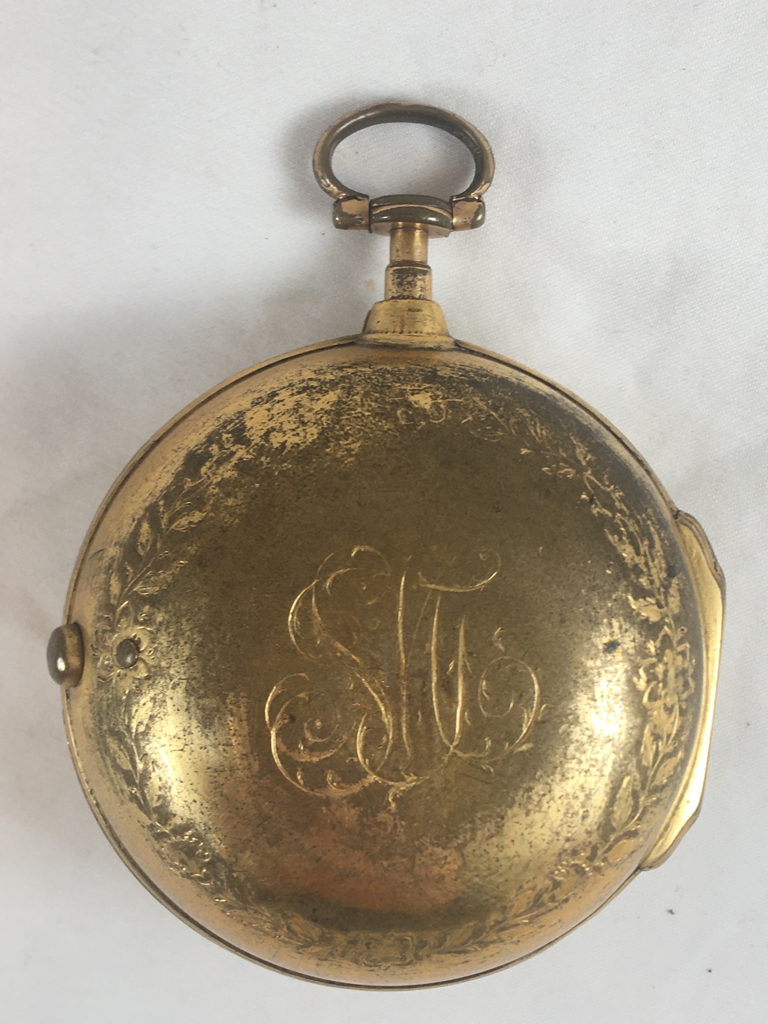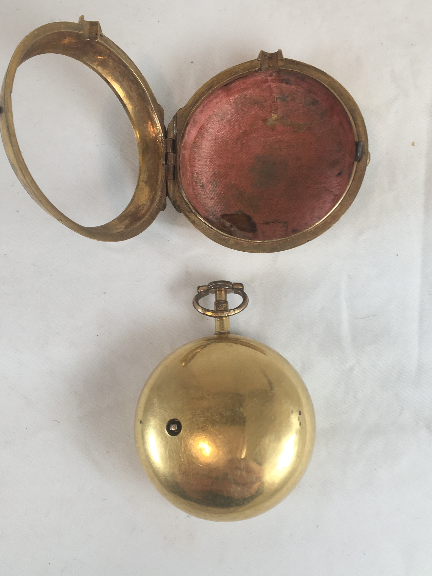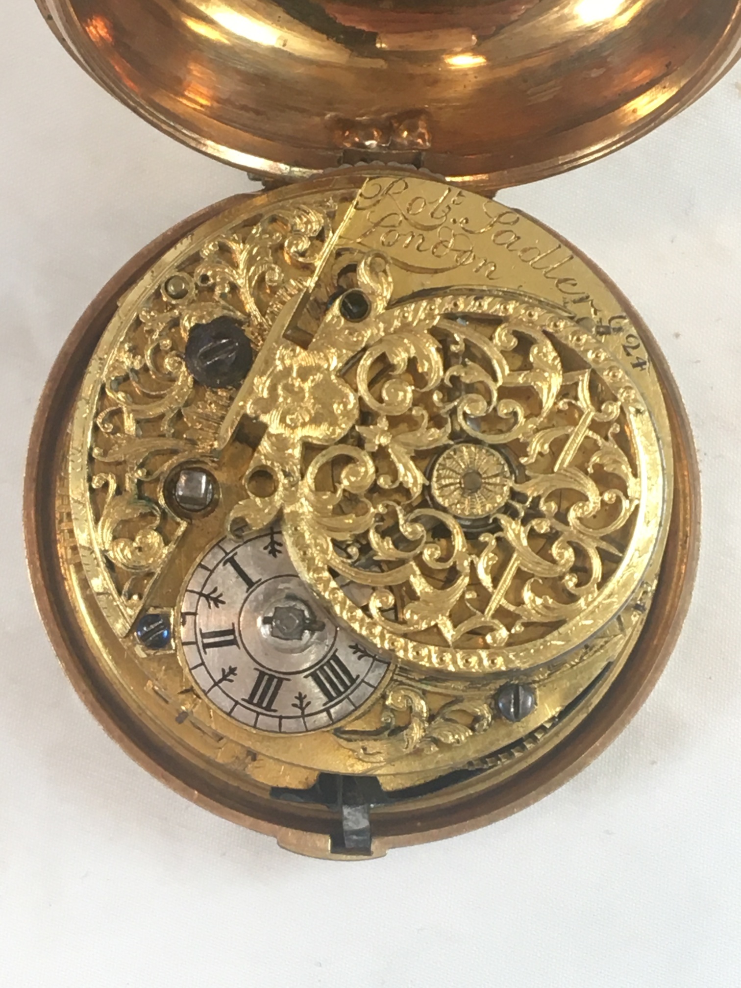 English verge fusee pocket watch. Movement signed "Robt Sadler, London 925", circa 1710, in brass gilt pair case with unidentified mark (T<pellet>G under a small bow-tie shape), circa 1780. Egyptian pillars. In working order.
