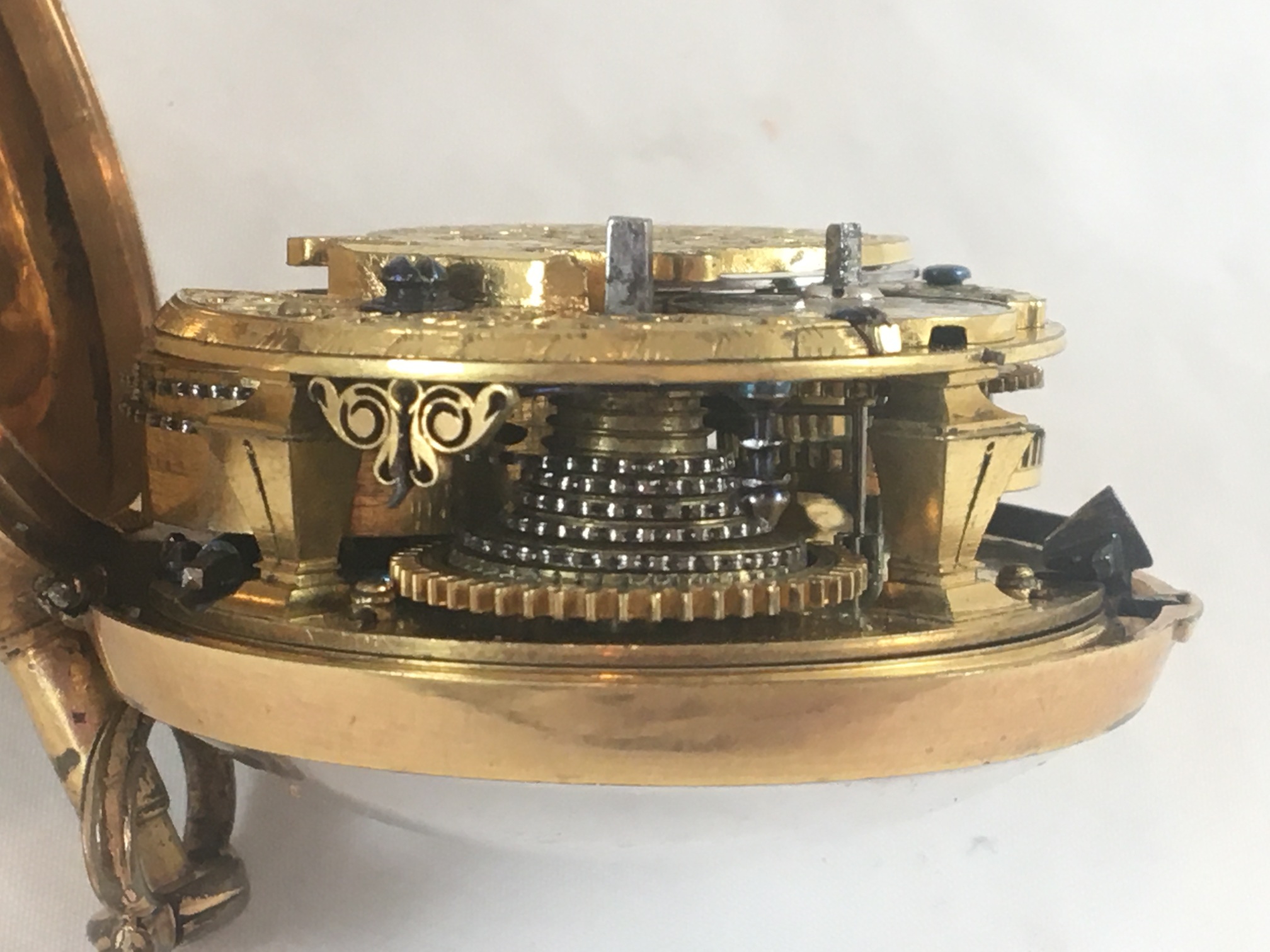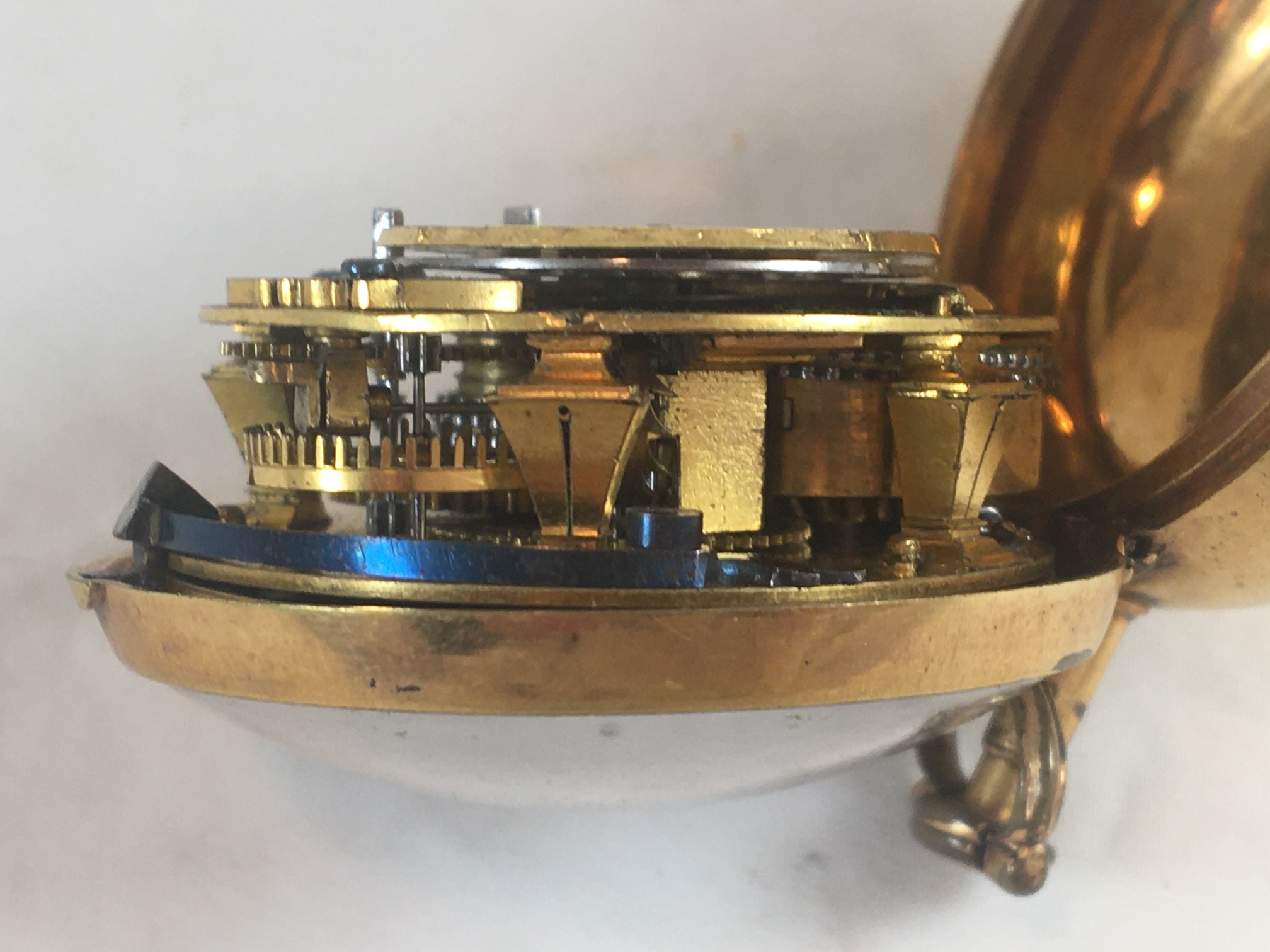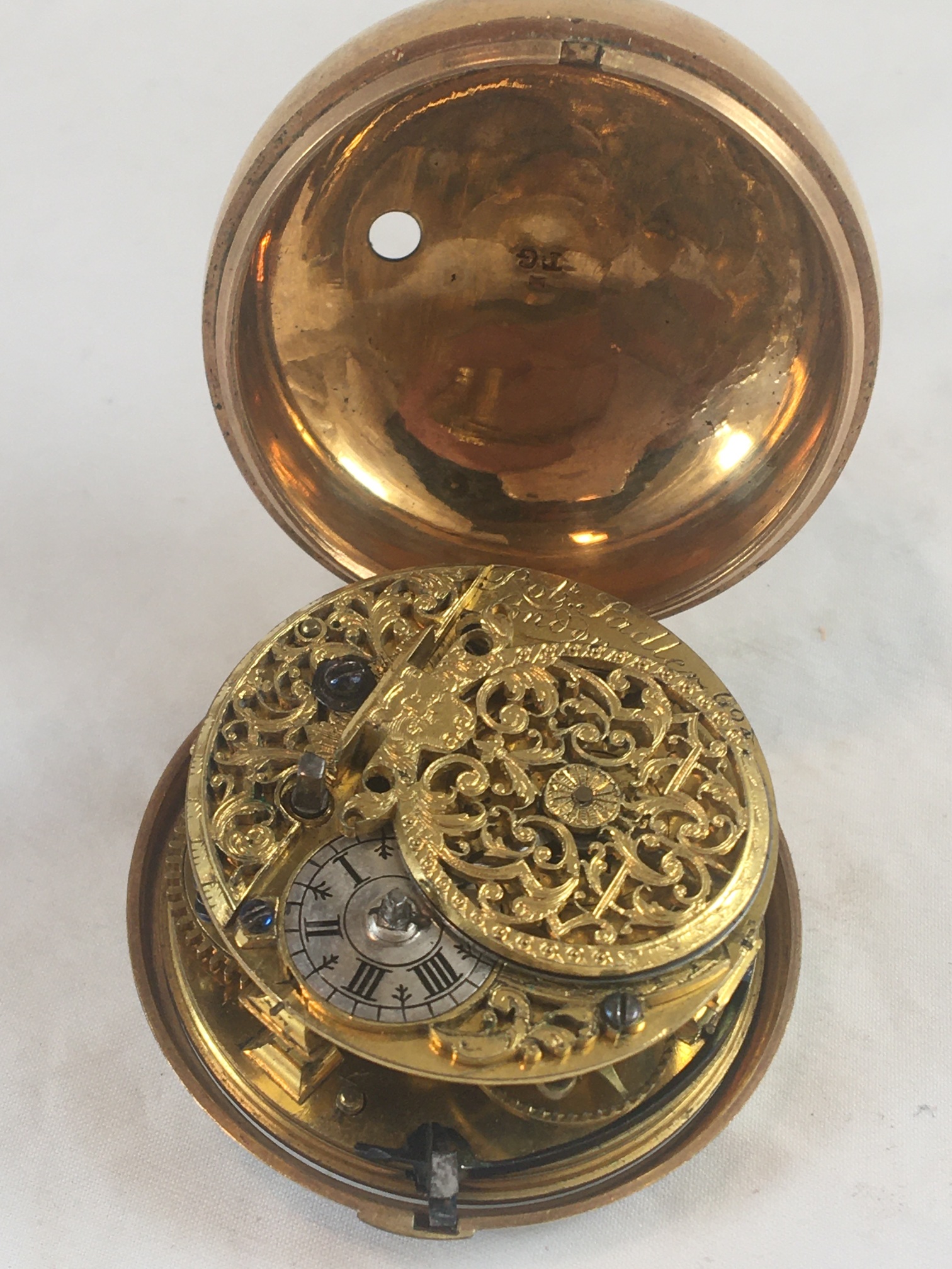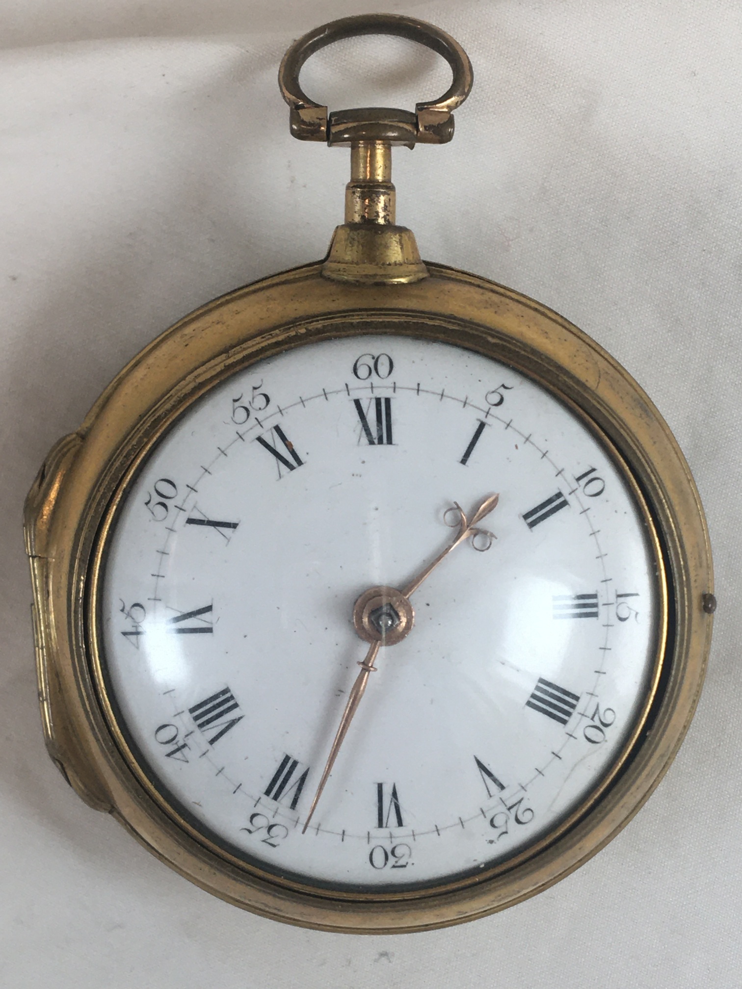 English verge fusee pocket watch. Movement signed "Robt Sadler, London 925", circa 1710, in brass gilt pair case with unidentified mark (T<pellet>G under a small bow-tie shape), circa 1780. Egyptian pillars. In working order.