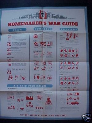 Poster divided into four sections: Plan, Conserve, Salvage (recycle) and Air Raid Protection. Gives tips on running a household.