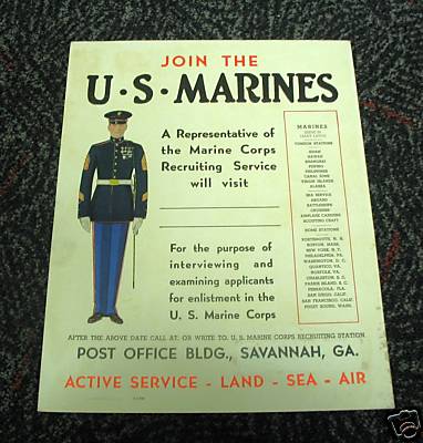 Original poster on thin card stock, "JOIN THE U.S.MARINES", Post Office Building, Savannah, GA. Shows NCO in dress blues with sword standing at attention.