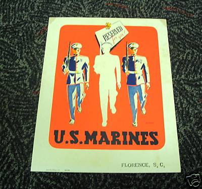 Poster with red background shows two Marines marching in dress blues with Springfield rifles. A white silouette in the middle is left open "for you". "U.S.MARINES" at bottom, with stars for periods. Signed "JOE RICHARDS".