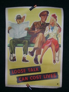 A soldier is talking to a pretty blonde, with a newspaper-reading Hitler with a giant left ear sitting next to them.