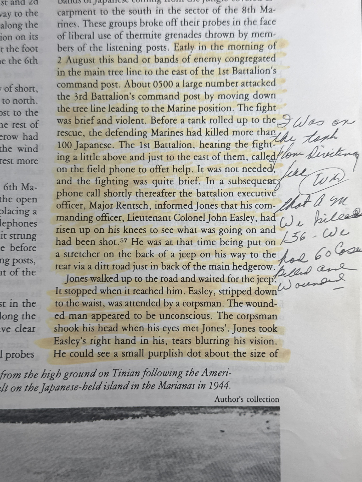 Portions of text on the battle of Tinian are highlighted by WWH, with handwritten notes in sidebar: