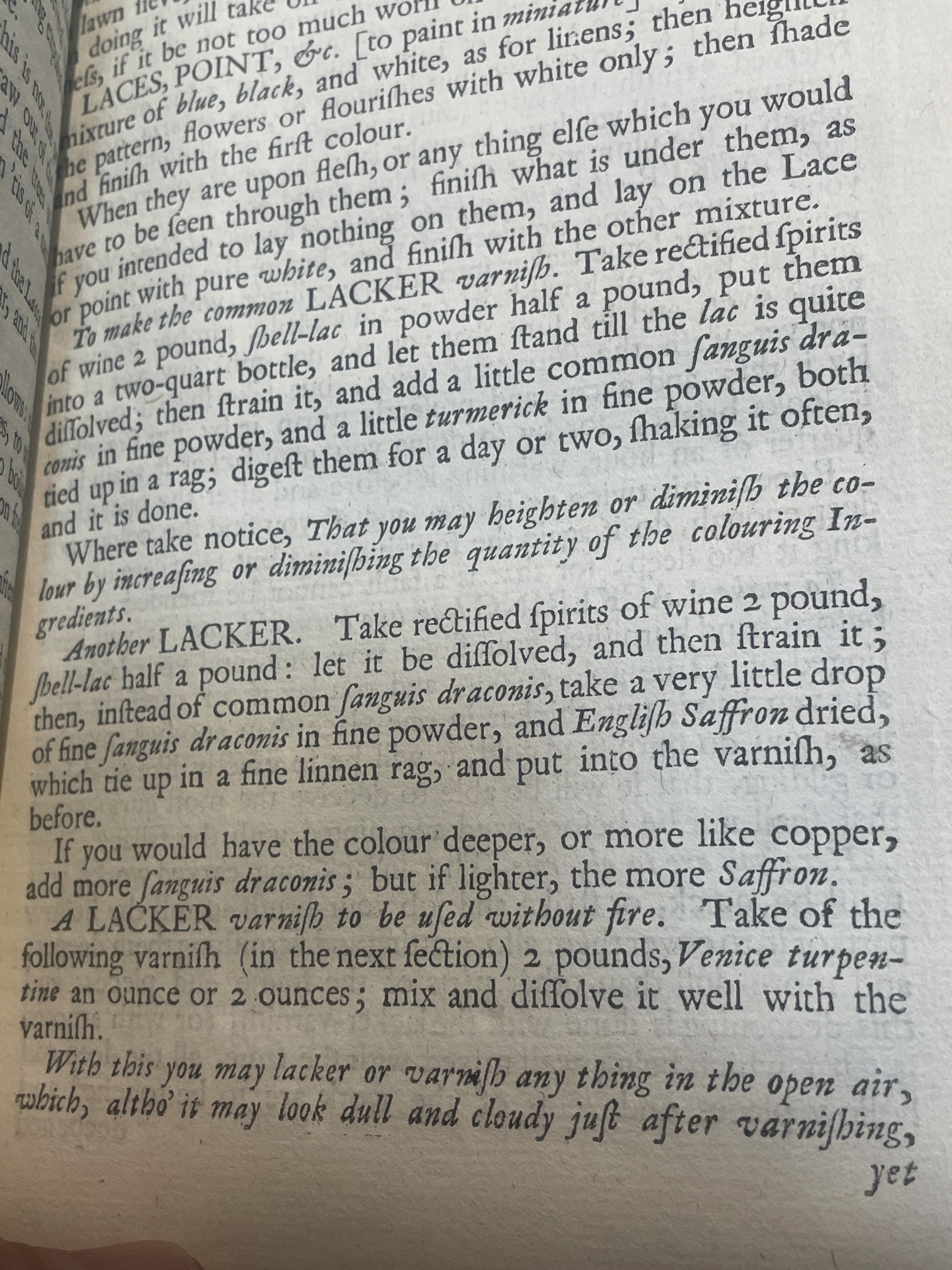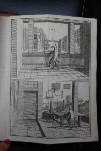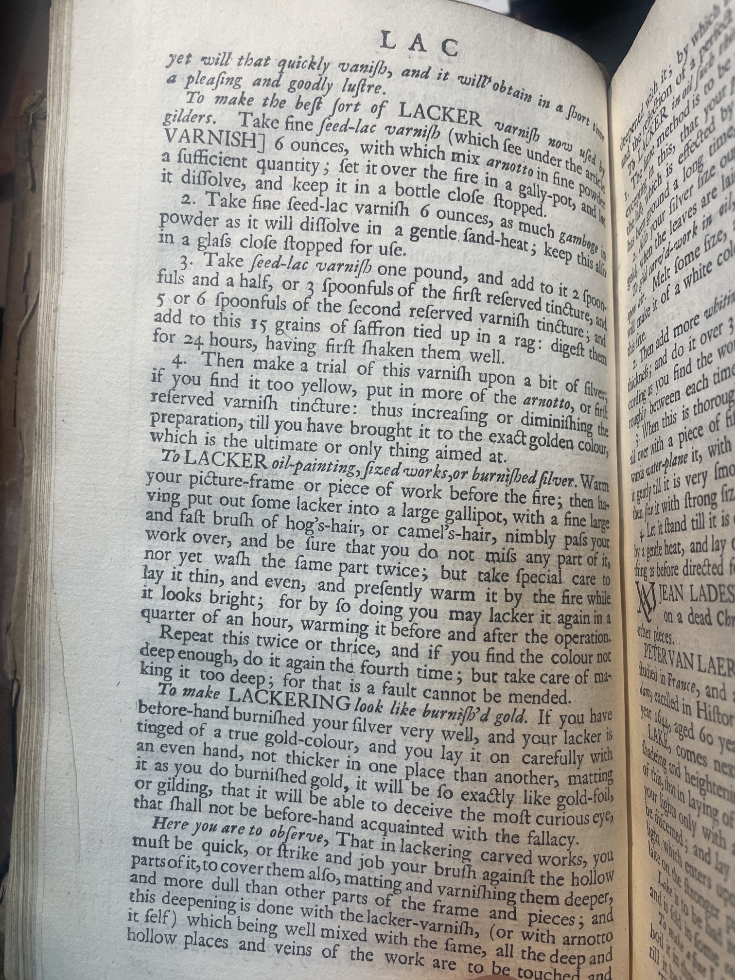 | Description | "Dictionarium Polygraphicum: Or, The Whole Body of Arts Regularly Digested Containing, I. The ARTS of Designing, Drawing, Painting, Washing Prints, Limning, Japanning, Gilding in all their various kinds. Also Perspective, the Laws of Shadows, Dialling, &c. II. Carving, Cutting in Wood, Stone; Moulding and Casting Figures in Plaister, Wax, Metal; also Engraving, and Etching, and Mezzotinto. III. A brief historical Account of the most considerable Painters, Sculptors, Statuaries , and Engravers, with those Cypers or Marks by which their Works are known. IV. An Explanation of the Emblematical and Hieroglyphical Representations of the Heathen Deities, Powers, Human Passions, Virtues, Vices, &c. of great Use in History Painting. V. THe Production, Nature, Refining, Compounding, Transmutation and Tinging of all sorts of Metals and Minerals of various Colours. VI. THe ARGS of Making, Working, Painting, or Staining all sorts of Glass and Marble; also Enamels, the imitation of all sorts of Precious Stones, Pearls, &c. according to the Practice both of the Antients and Moderns. VII. Dying all sorts of Materials, Linen, Woollen, Silk, Leather, Wood, Ivory, Horns, Bones; also Bleaching and Whitening Linen, Hair, &c. VIII. The ART of Tapestry-Weaving, as now performed in England, Flanders and France, either of the high or low Warp; also many other curious Manufactures. IX. A Description of Colours, Natural and Artificial, as to their Productions, Natures or Qualities, various Preparations, Compositions and Uses. X. THe method of making all kinds of Inks, both Natrual and Sympathetical; and also many other Curiosities not here to be specified, whereby this is rendred a more Compleat Work than has hitherto appear'd in any language. Adorned with proper Sculptures, curiously Engraven on more than fifty Copper Plates. VOL. I. LONDON: Printeed for C. HITCH and C. DAVIS in Paternoster Row, and S. AUSTEN in St. Paul's Church-Yard. MDCCXXXV." Period leather spine. Detatched boards are not original (or one is, but repaired?) Original owner signature on title page, "Arminella Sharman" (possibly of County Down, NI, died 1865). Some plates detatched. (need inventory***). Covers J-ZUC, plus supplements. See: "Dictionarium Polygraphicum: Or, The Whole Body of Arts Regularly Digested", Vol. I.. Interesting entry on Foliating looking glasses (silvering mirrors). A good section on "Dialling", or making sundials. Topic: brslac photos: 2-3 |