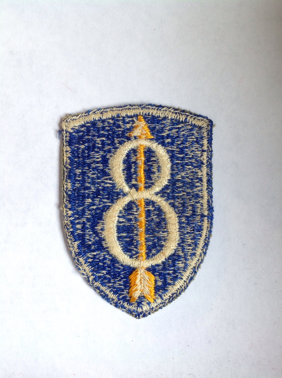 Shoulder patch: blue shield with white "8" with yellow arrow pointing up through it.