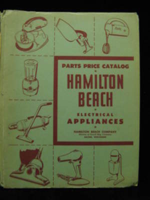 Green card 3-hole binder with printed tape ("HAMILTON BEACH") spine. Contains approximately 35 pages of illustrated, typewritten sheets covering a variety of Hamilton Beach appliances, including: