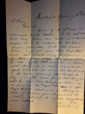 | Description | Letter on lined paper dated Smethport, January 11, 1882, with faint embossed mark in upper right. Letter is regarding 24 acres of valuable oil land that I Cary owned? [ needs some deciphering ] Related to Letter from Delano R. Hamlin to Isaac Carey, Esq.. |