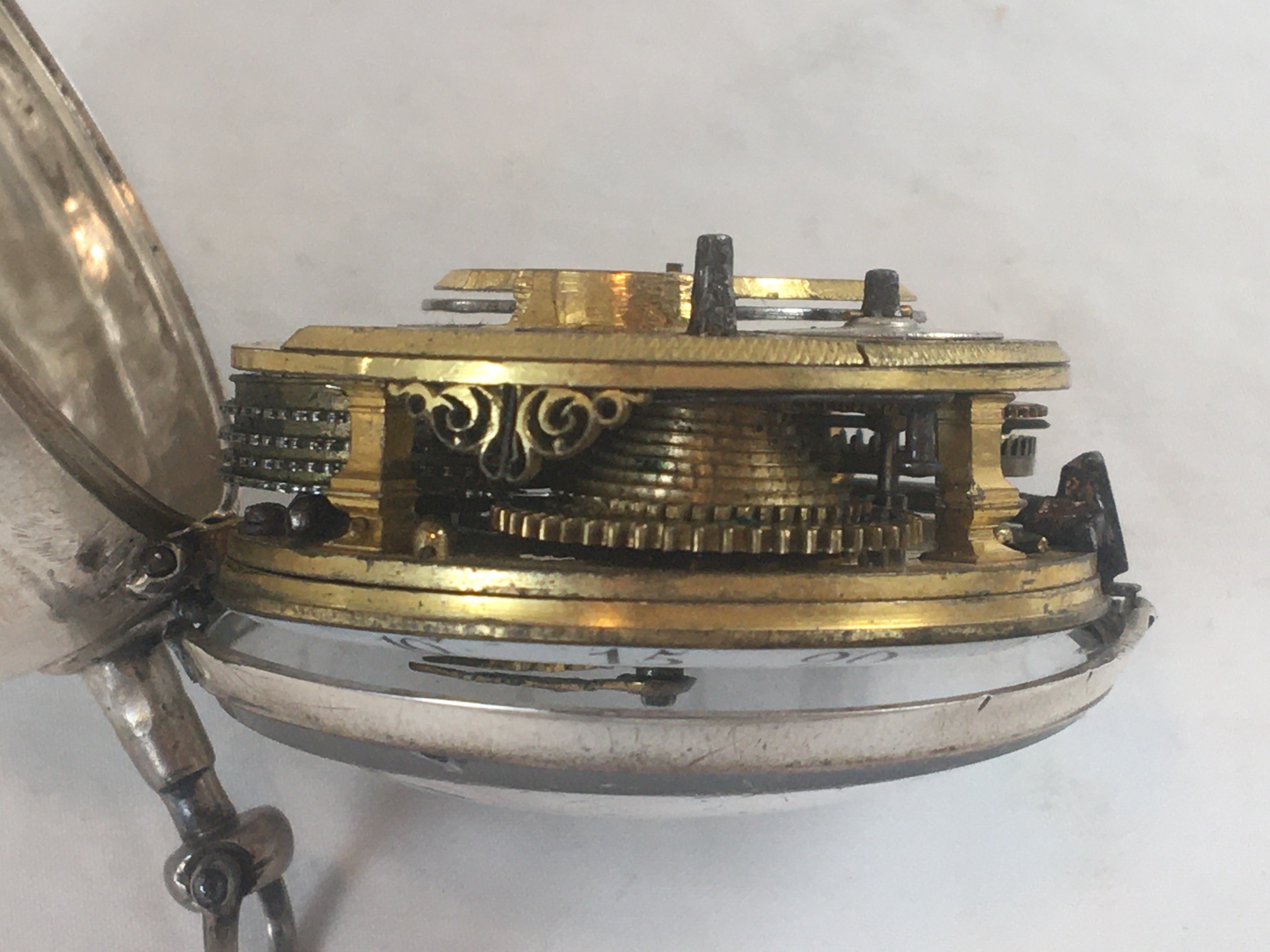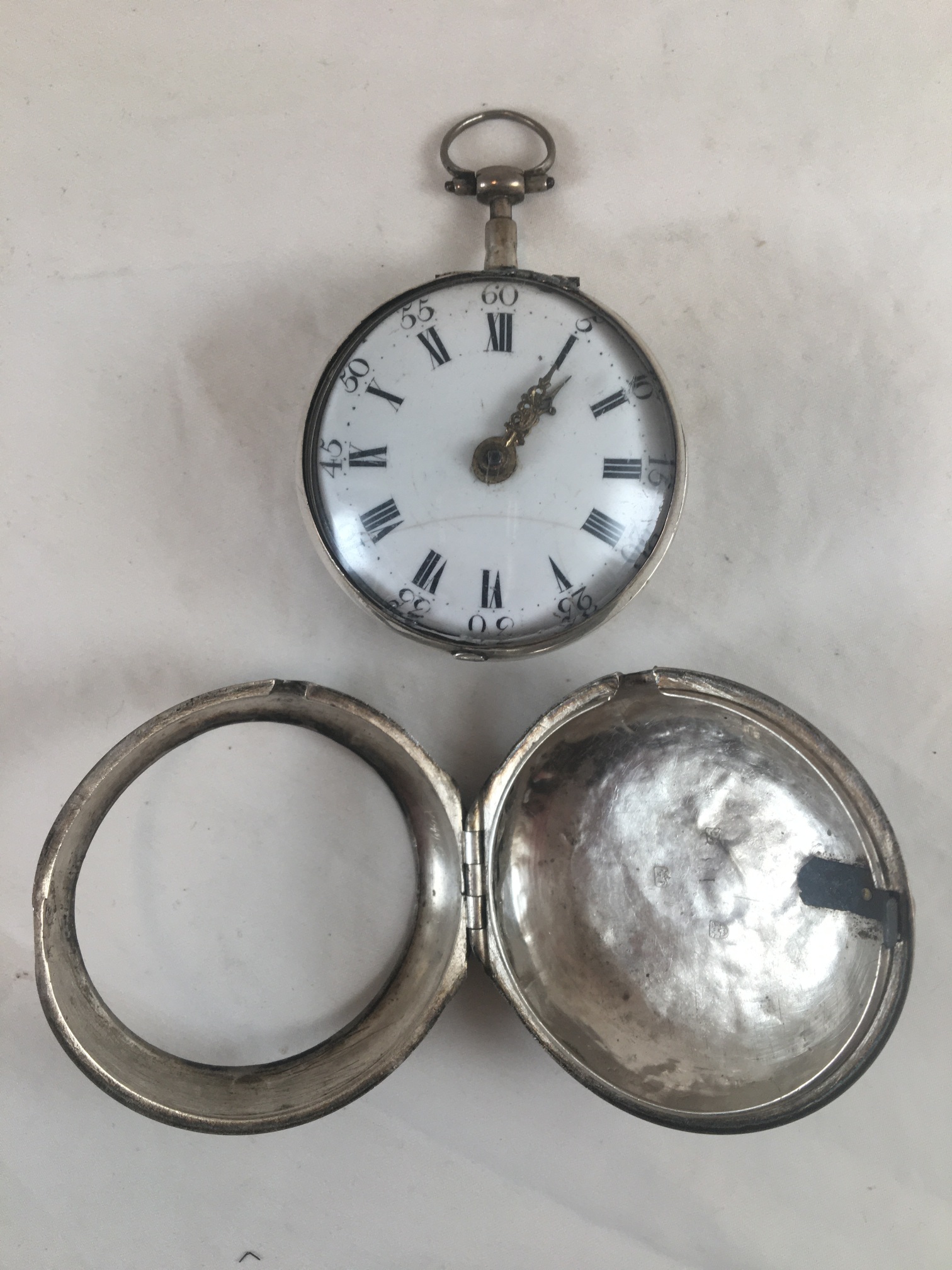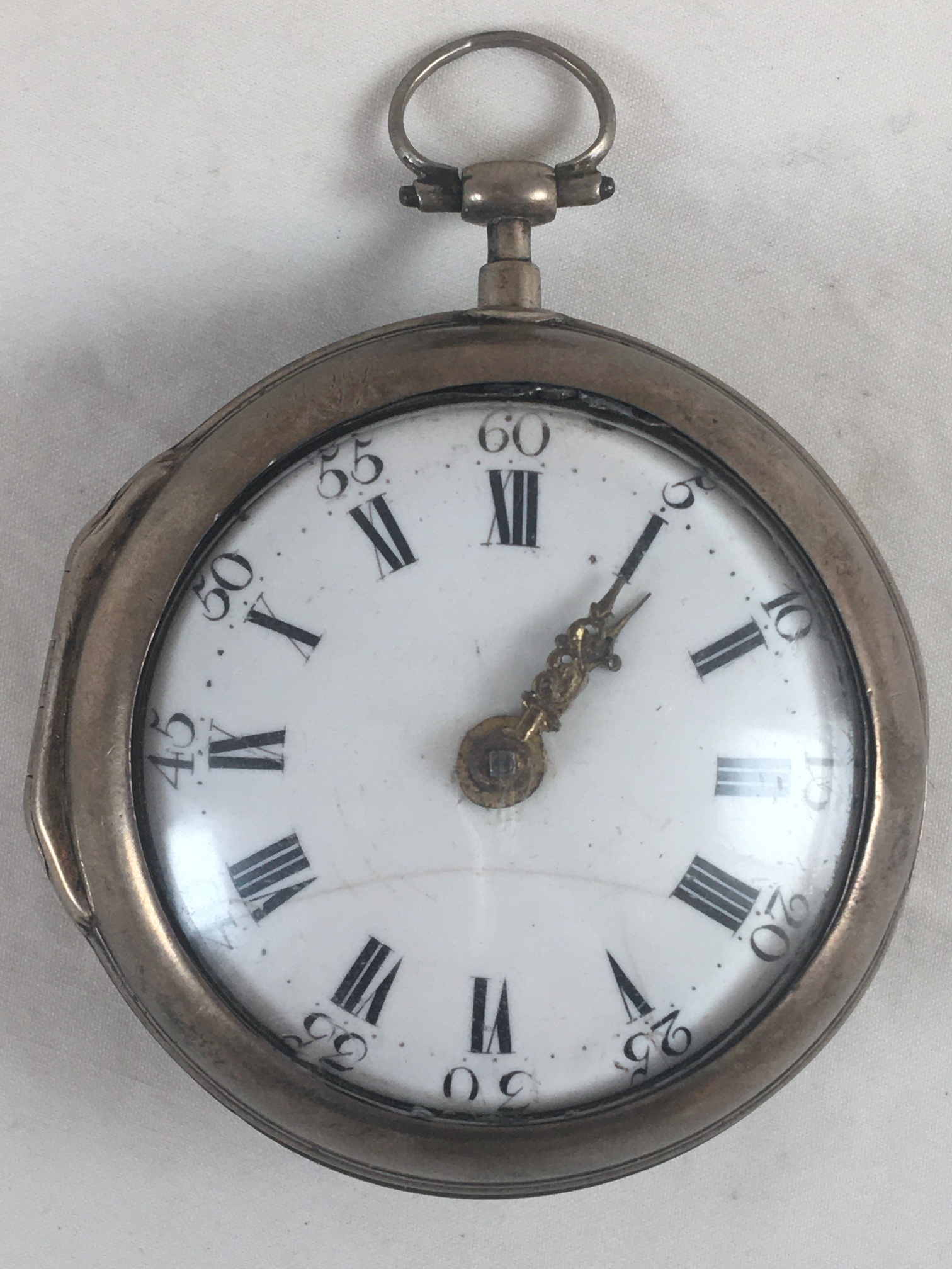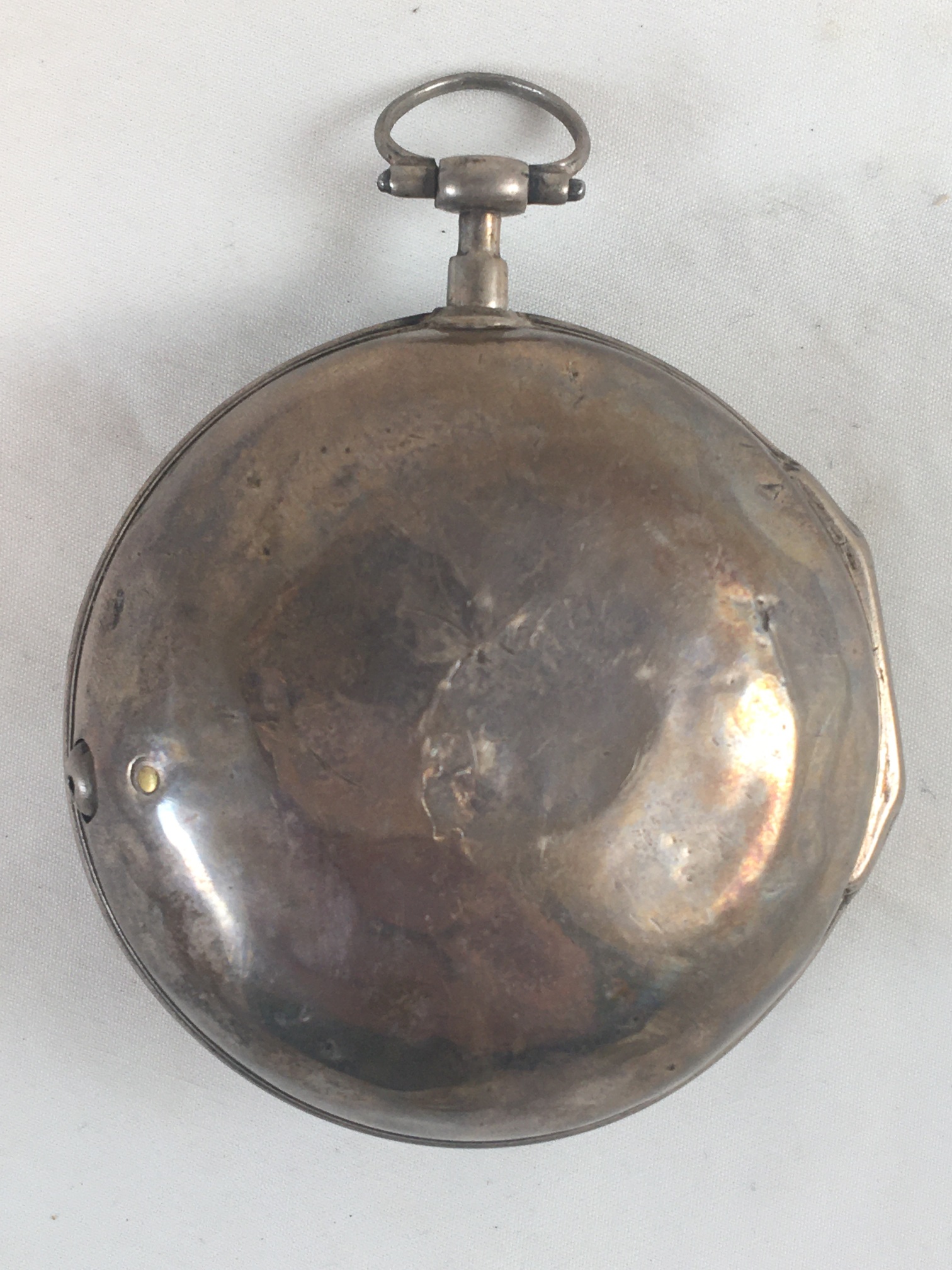 A worn and dented silver pair case watch, both cases hallmarked 1767 (M) with worn maker's mark, possibly "IR" in block letters.
