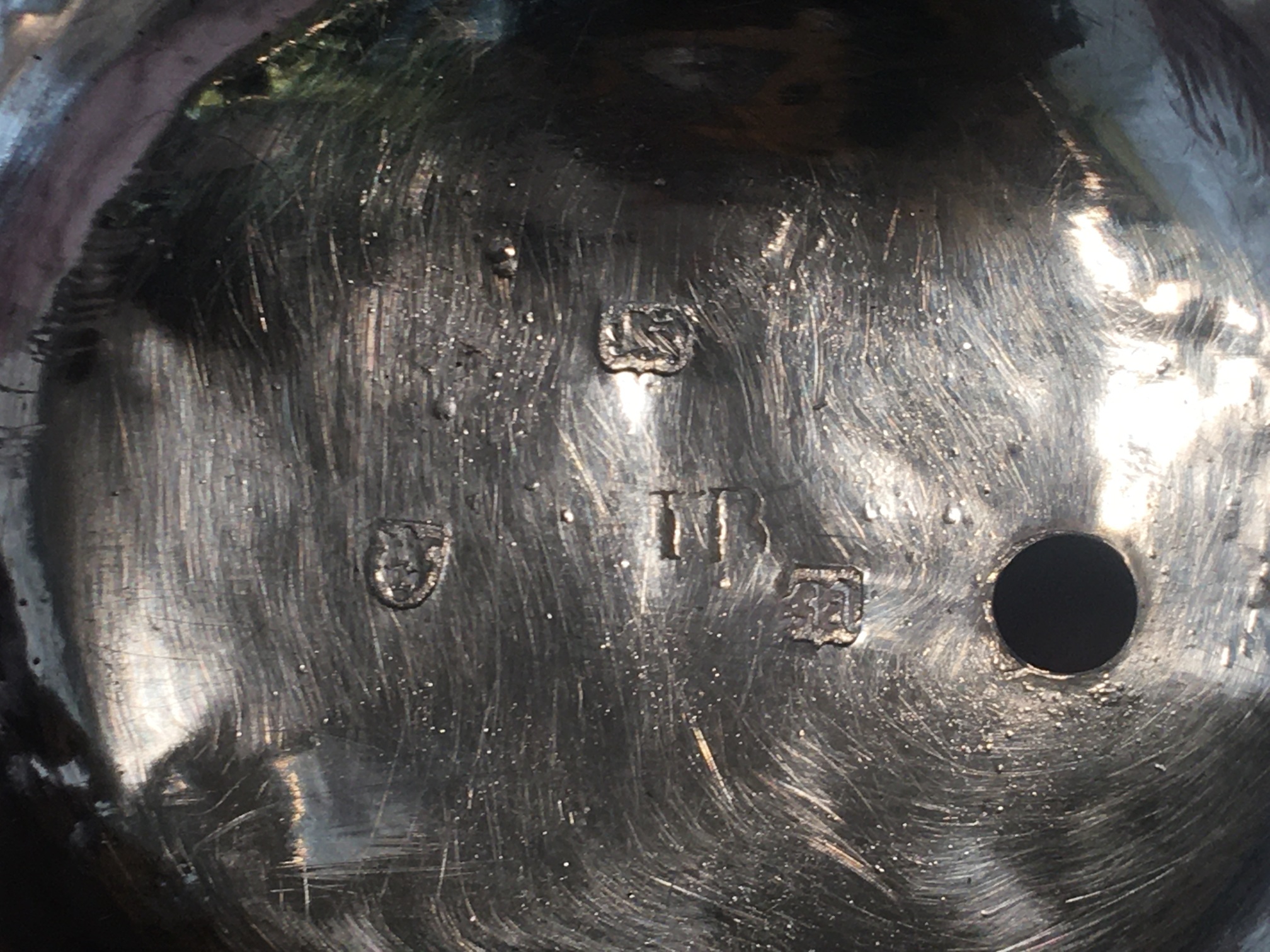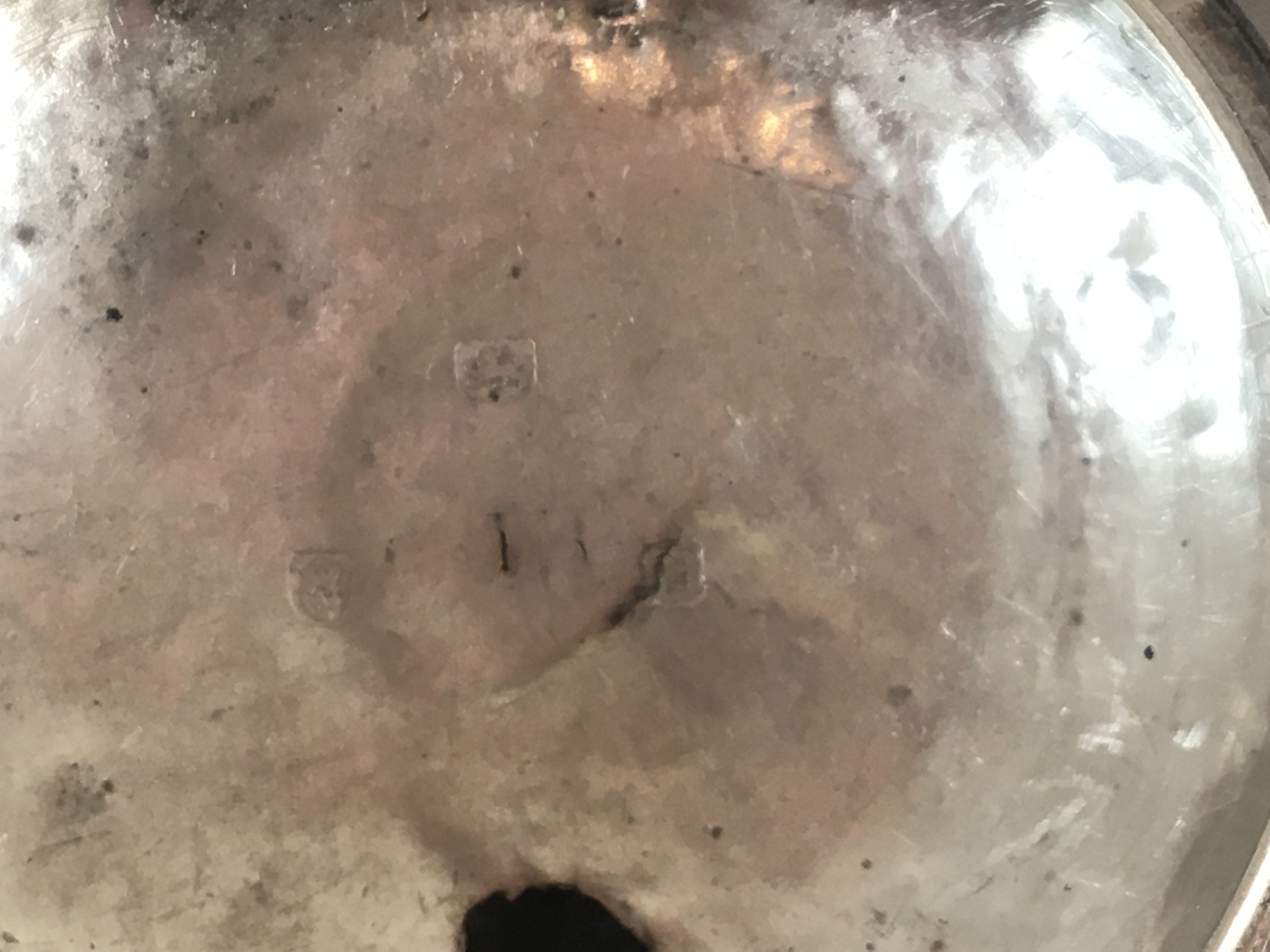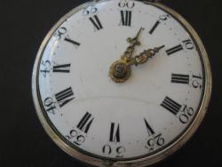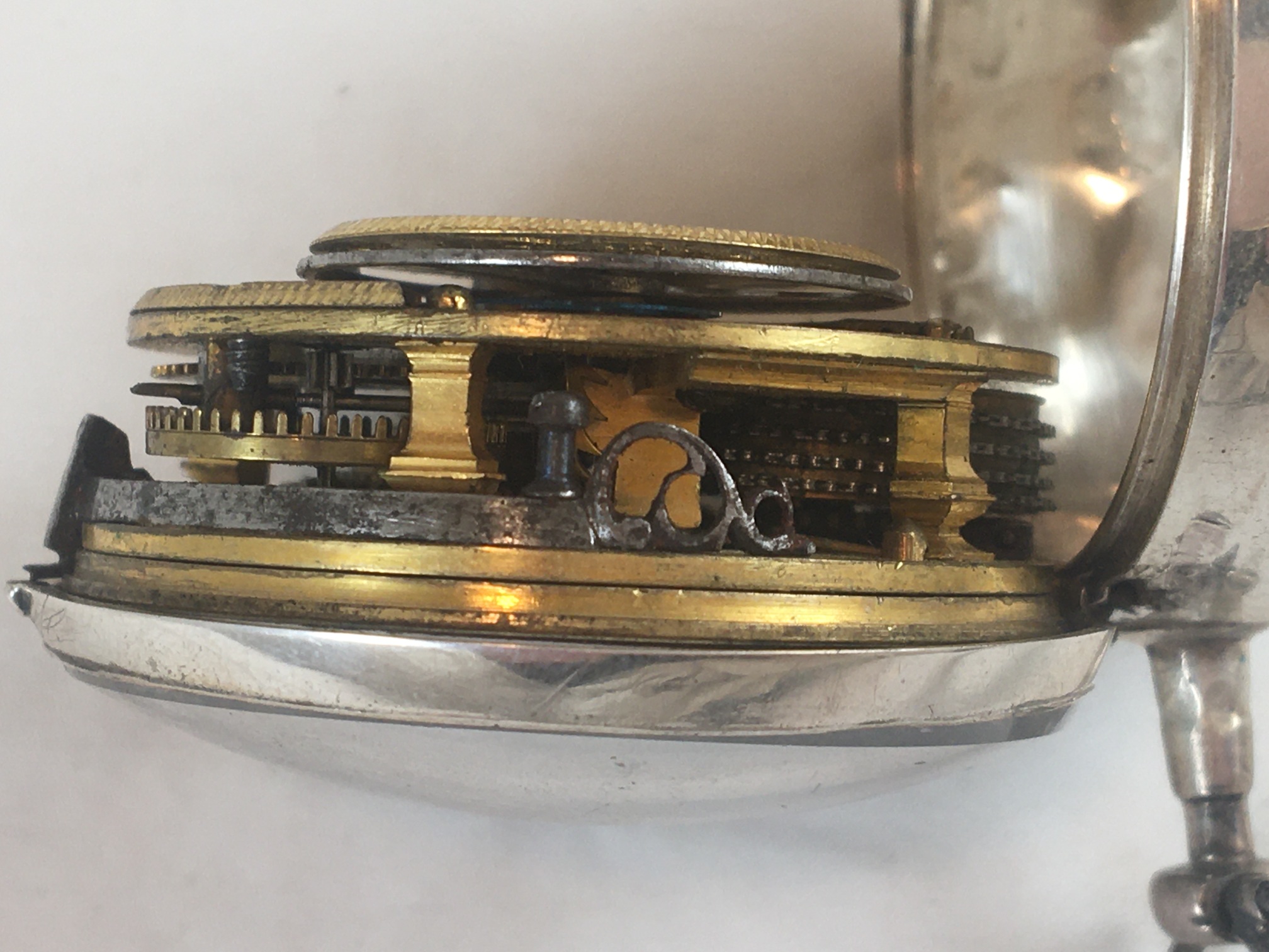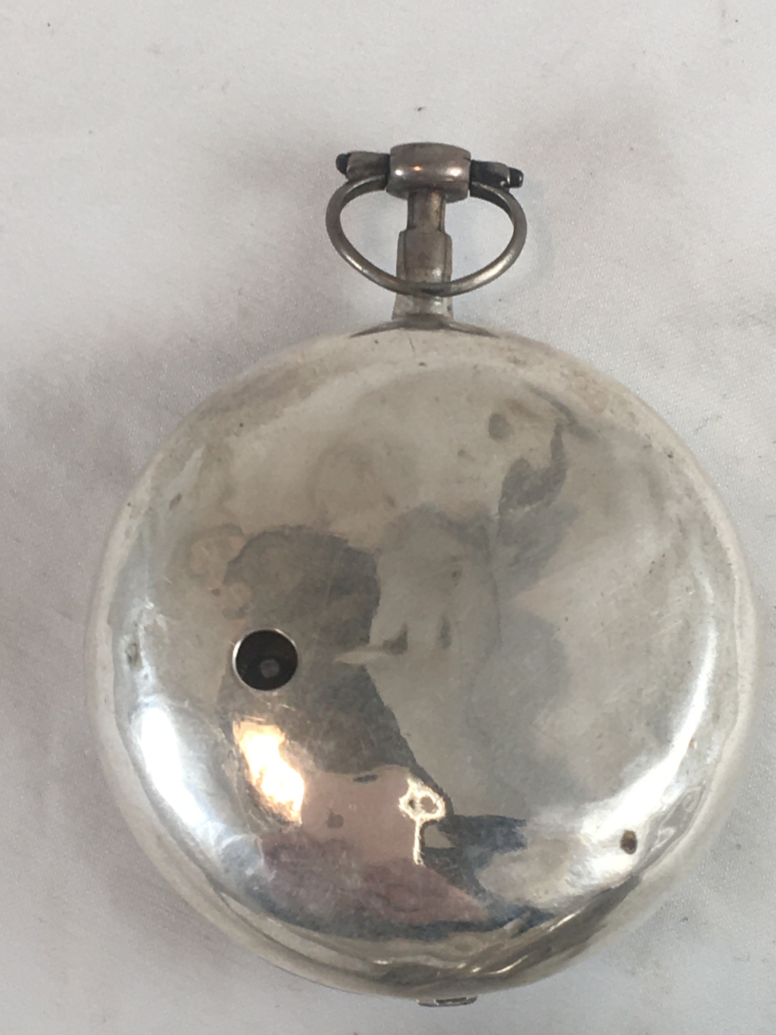 A worn and dented silver pair case watch, both cases hallmarked 1767 (M) with worn maker's mark, possibly "IR" in block letters.