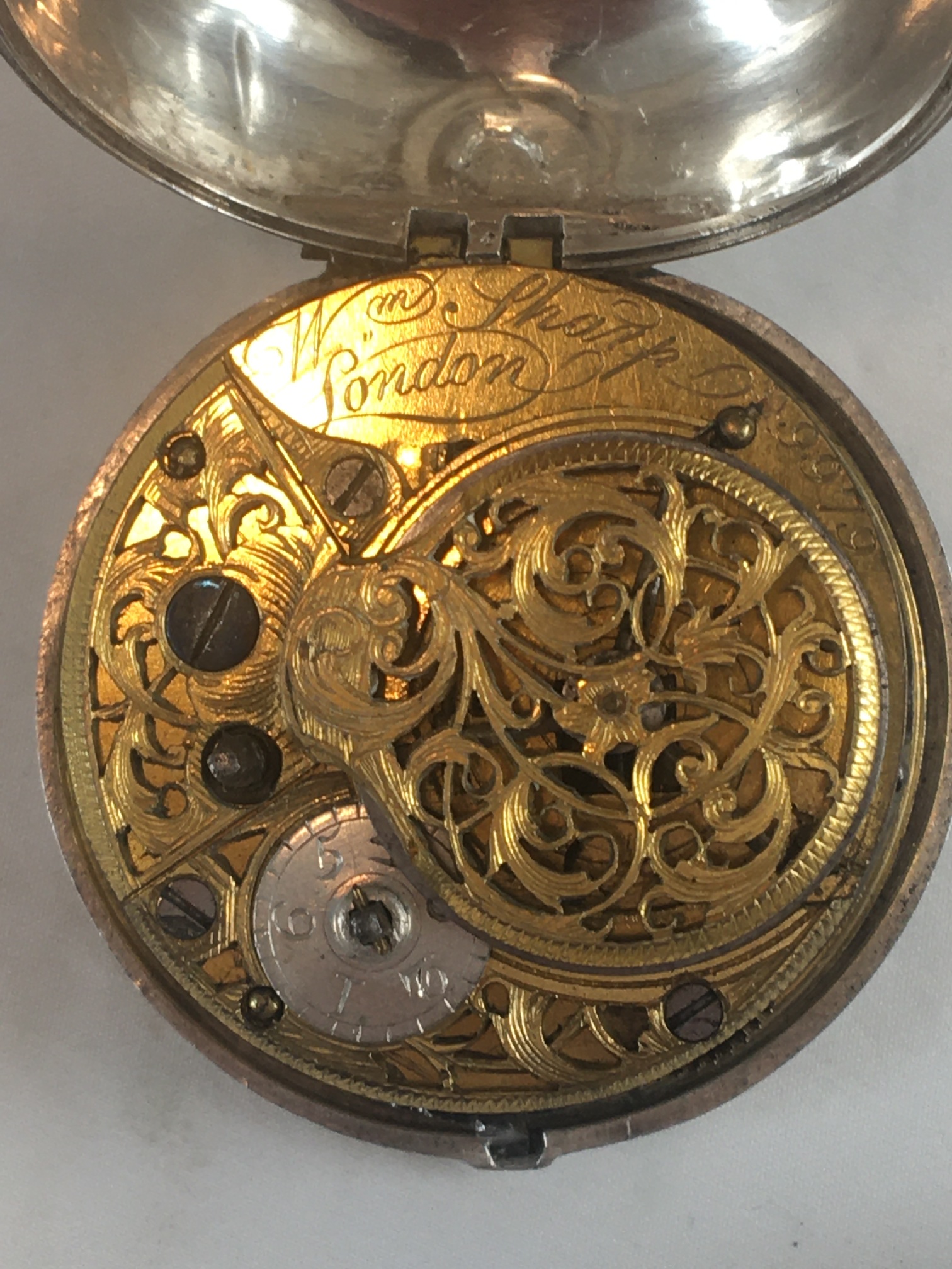 The gilt verge fusee movement is signed "Wm Sharp London 9979". The cock's 90-degree pierced foot and the pierced sideplate, along with the square pillars and the large minute numbers on the face, all point to a 1760s date. A crack and small chip on the face. Small chips to the crystal. Gilt hands. The inner case has a rough repair to the hinge.