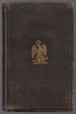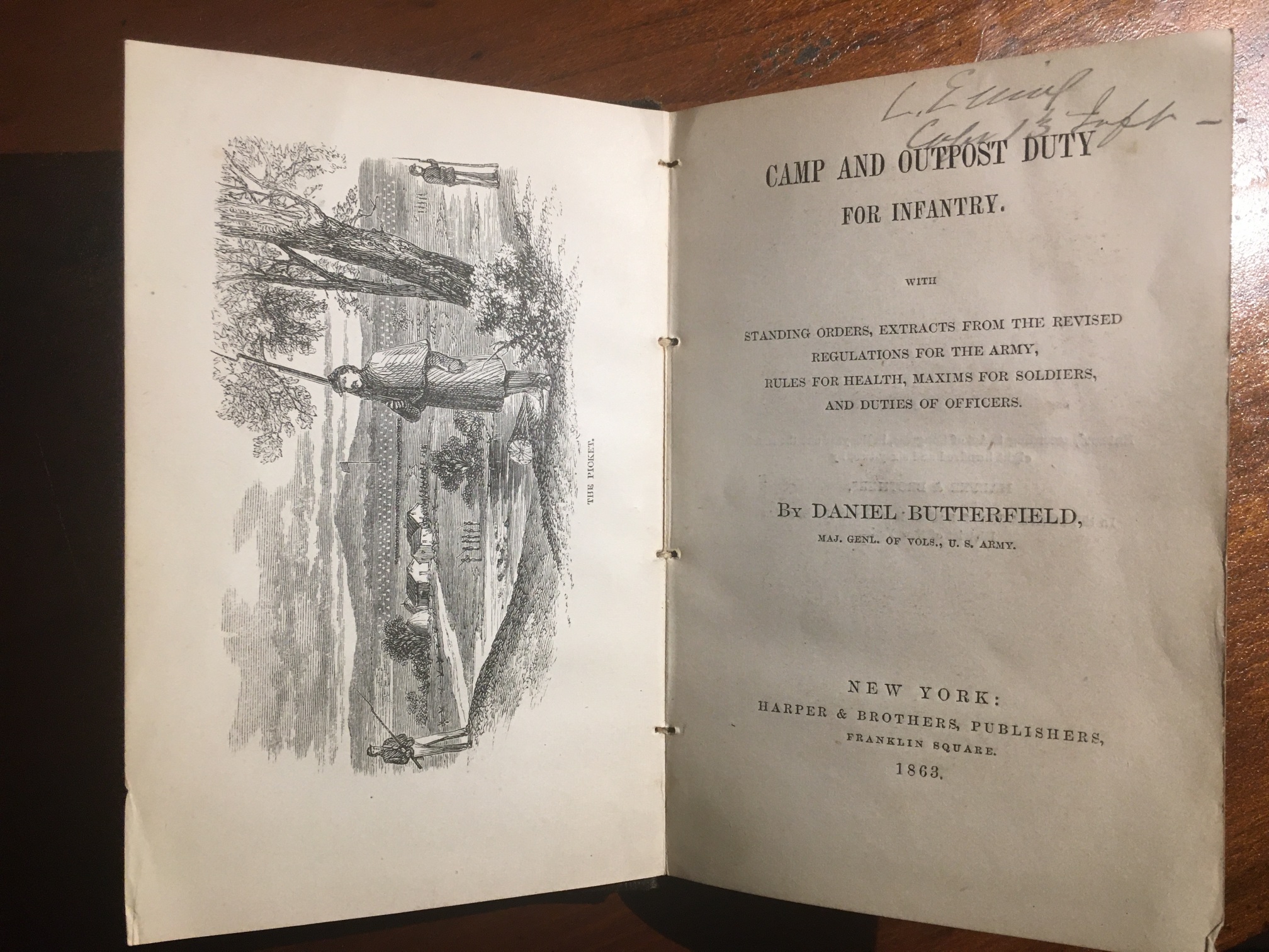 Small cloth bound book with gilt lettering "BUTTERFIELD'S CAMP AND OUTPOST DUTY FOR INFANTRY" on spine and gilt eagle, drum and weapons on cover.