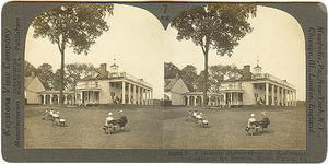 Curved round-top stereoview on grey card showing people sitting on benches at Mt. Vernon, from the river side of the house.