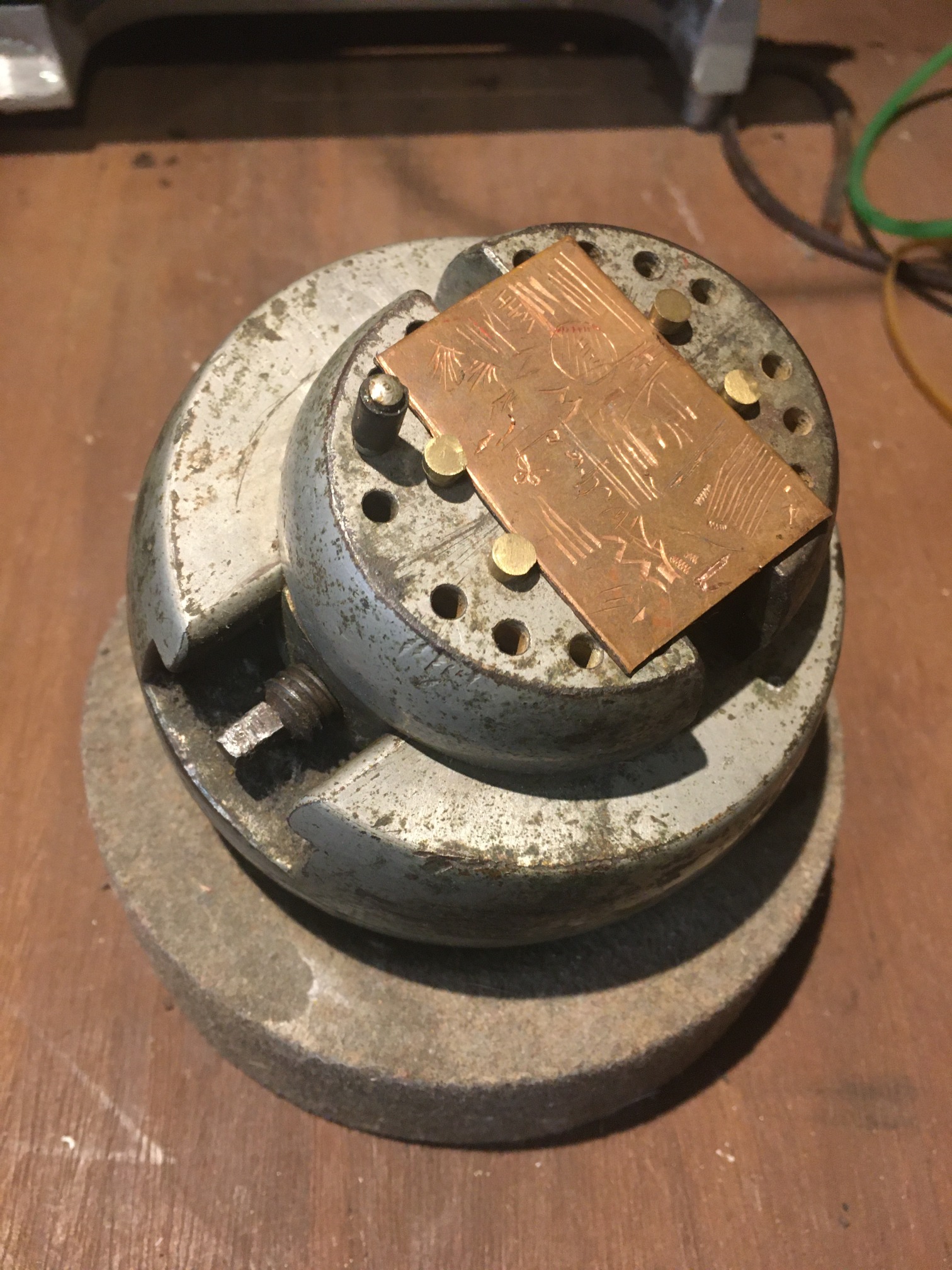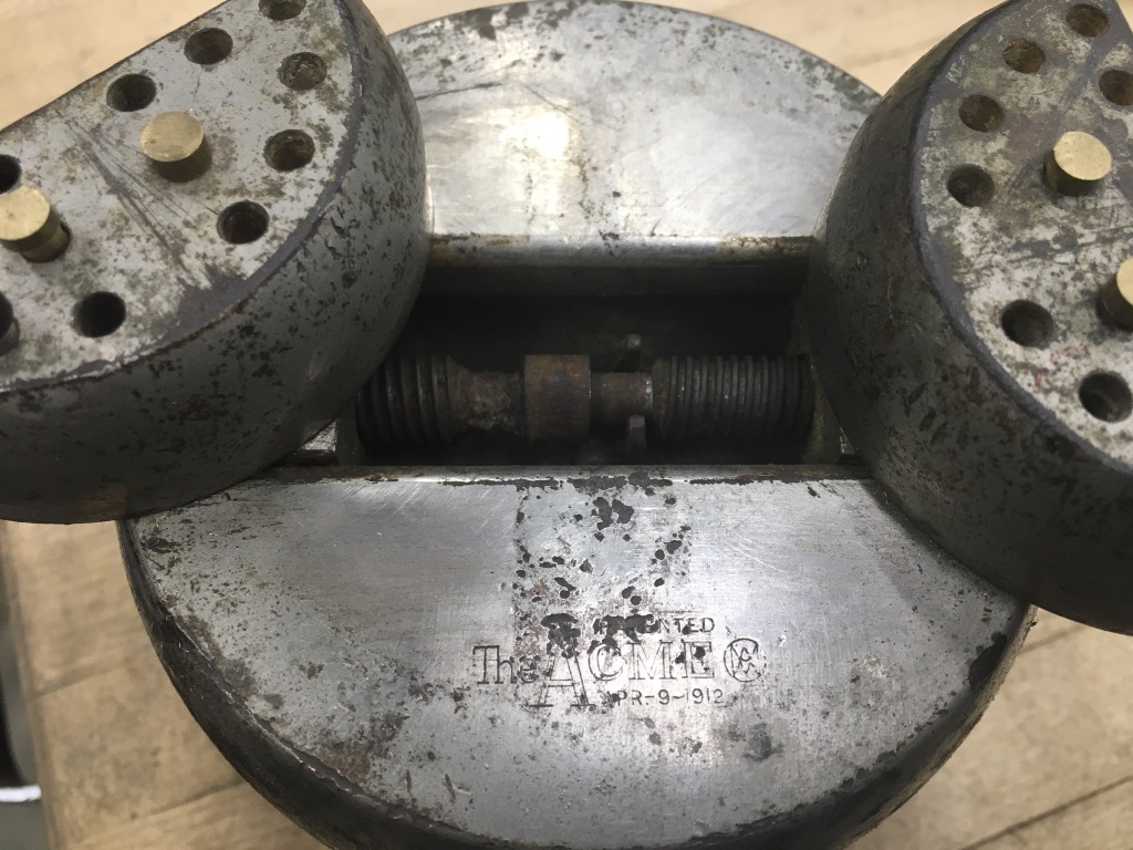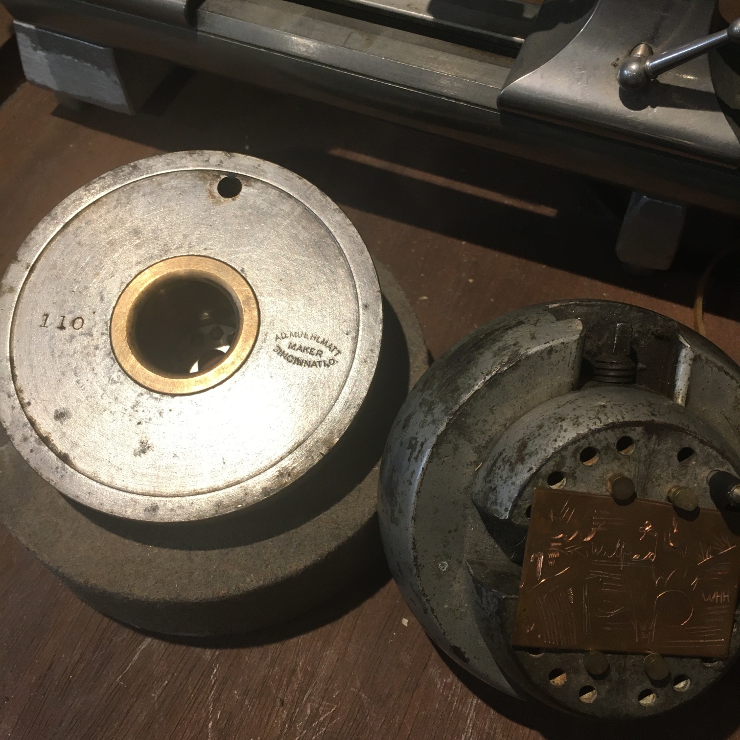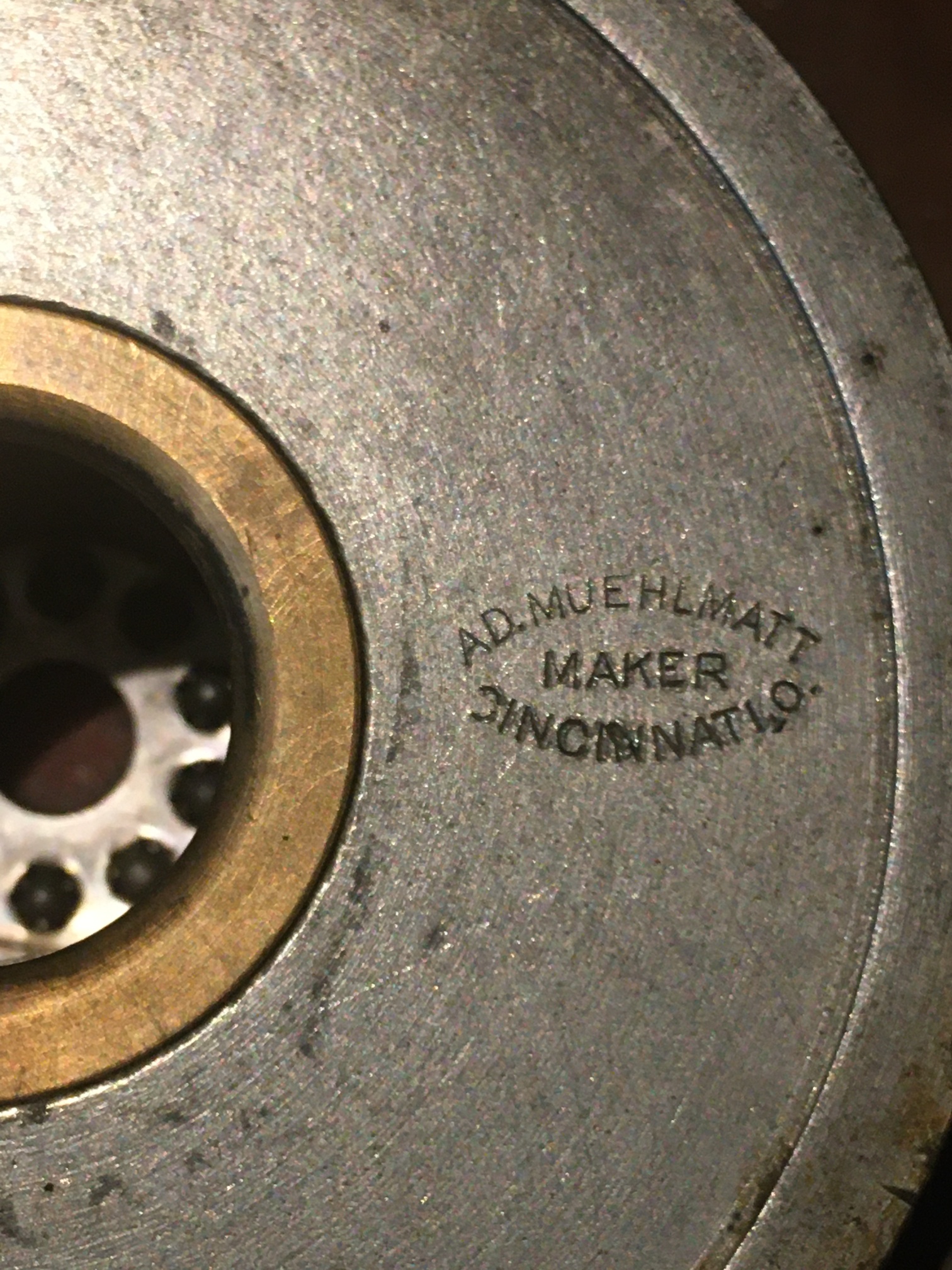 | Description | 4-inch engraver's ball, marked "The ACME", "APR-9-1912". Lower half marked "AD.MUEHLMATT", "MAKER", "CINCINNATI,O" and "110" on top. With felt base. Adolph Muehlmatt emigrated from Switzerland in 1891, and began producing tools in Cincinnati the following year. His company was acquired by the Hamilton Tool Co. after his death in 1937. See: "The Special" engraver's ball vise, Adolph Muehlmatt, Cincinnati. Probably purchased from ebay during Spring 2007 blackout (data loss). |