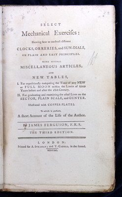 "SELECT | Mechanical Exercises: | shewing how to construct different | CLOCKS, ORRERIES, and SUN-DIALS, | or Plain and Easy Principles. | with several | Miscellaneous Articles; | and | New Tables, | I. For expeditiously computing the Time of any NEW | or FULL MOON within the Limits of 6000 | Years before and after the 18th Century. | II. For graduating and examining the usual Lines on the | SECTOR, PLAIN SCALE, and GUNTER. | Illustrated with COPPER-PLATES. | To which is prefixed, | A short Account of the Life of the Author. | By JAMES FERGUSON, F.R.S. | The THIRD EDITION. | LONDON: | Printed for A. STRAHAN; and T. CADELL, in the Strand. | MDCCXC."