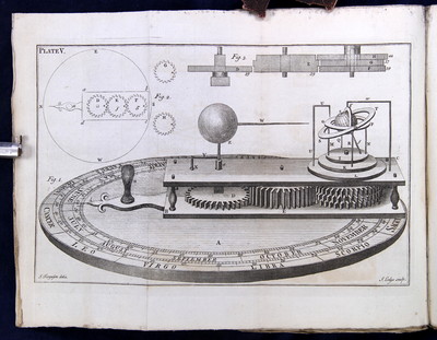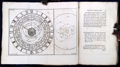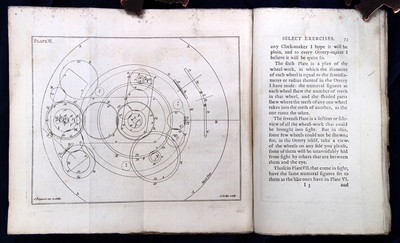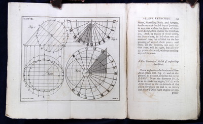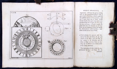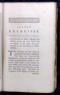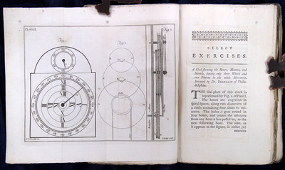 Starts off with an engraving and description of a three-wheel clock by Benjamin Franklin, a friend of the author, followed by improvements to the design suggested by the author. Franklin's original design was unusual in that the hours spiraled toward the center, with hours every 90 degrees, so it was not obvious which hour was being indicated. Includes sundials. |