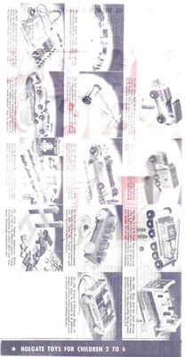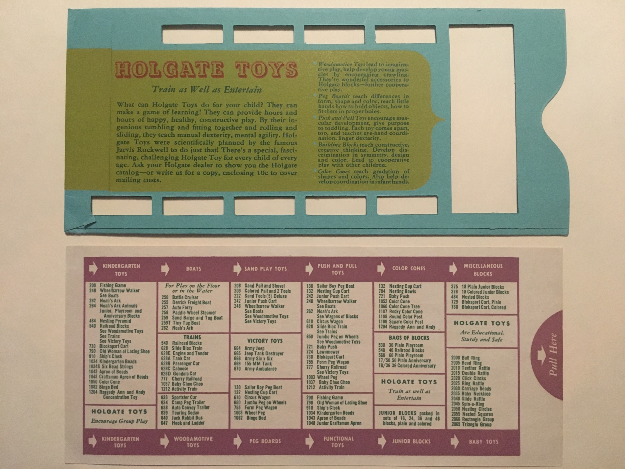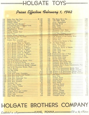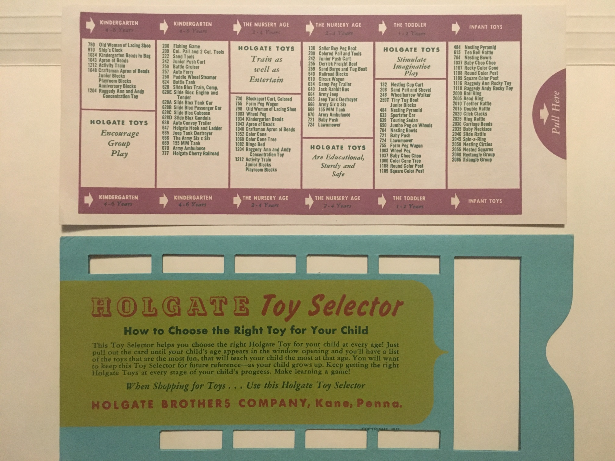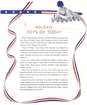 | Description | Small card envelope with windows showing a pull-out card. One side lists toys by age, the other by type. Includes several WWII-specific toys: No 624 Battle Tank No 665 Jeep Tank Destroyer No 666 The Army Six x Six No 669 155 MM Tank No 670 Army Ambulance. and the unknown No 250 Battle Cruiser (see "Holgate Toys of Today") Acquired as a group: "Holgate Toys ...provide many happy play hours" "Holgate Toy Selector" "Holgate Toys" price list, February 1, 1942 "Holgate-Hayco Baby Toys of Catalin Plastic" "Holgate Toys of Today" Holgate Toys form letter |