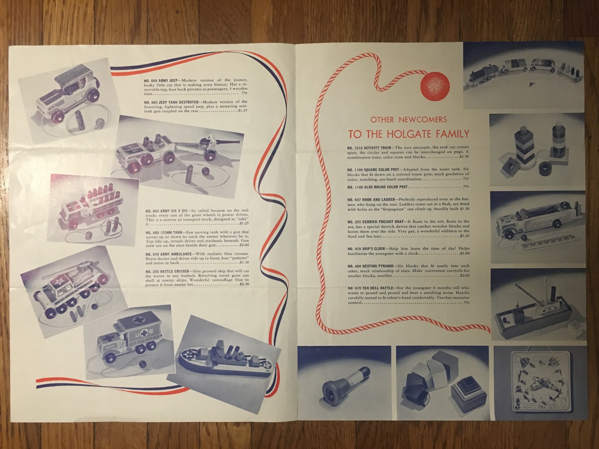 | Description | Single-sheet folded booklet, including several WWII-specific toys: No 664 Army Jeep No 665 Jeep Tank Destroyer No 666 Army Six x Six No 669 155 MM Tank No 670 Army Ambulance No 250 Battle Cruiser (see Holgate #250 "Battle Cruiser") Also: No 255 Derrick Freight Boat (Type II, not pictured elsewhere; see Holgate #255 "Derrick Freight Boat", Type II) Acquired as a group: "Holgate Toys ...provide many happy play hours" "Holgate Toy Selector" "Holgate Toys" price list, February 1, 1942 "Holgate-Hayco Baby Toys of Catalin Plastic" "Holgate Toys of Today" Holgate Toys form letter |