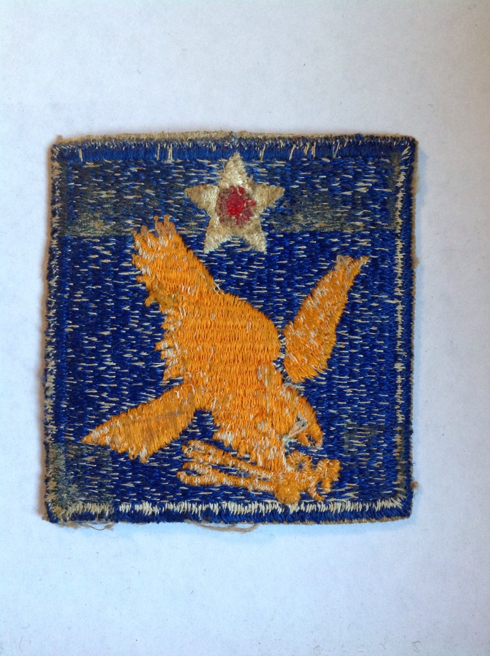 Shoulder sleeve insignia for the Second Air Force. A gold eagle under a white star with red center on a blue square background. Unused. Tape residue on back.