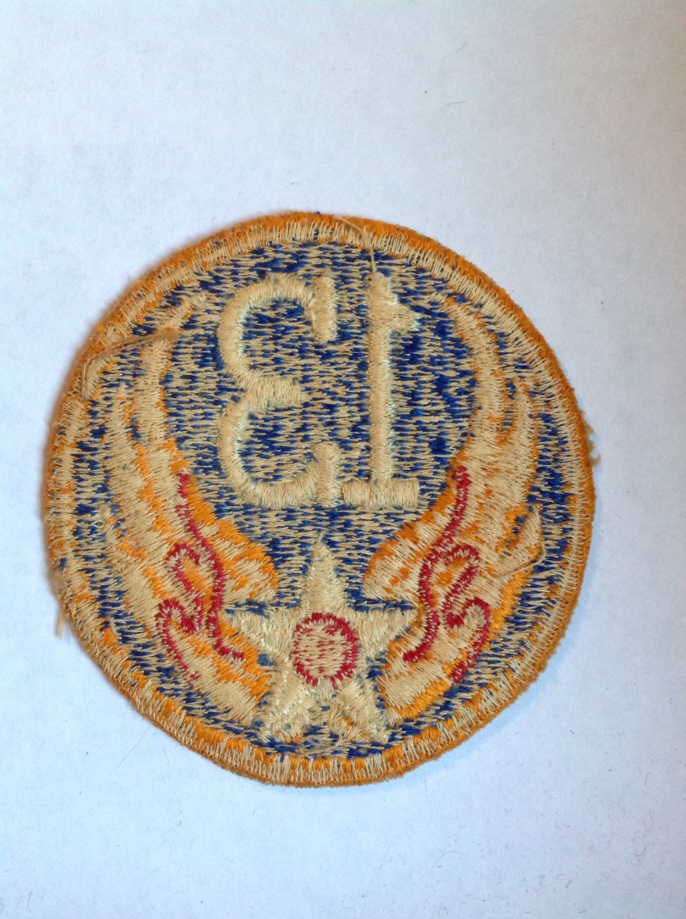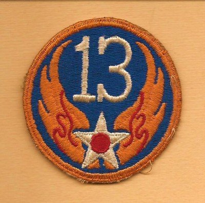 An embroidered blue circle with a gold border, with a gold-winged red-centered white star under a large white "13".