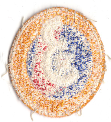 3rd Air Force shoulder sleeve insignia. A gold circle with a blue center, with a white "3" projecting through with a red tail, and a red-centered white star in the bottom loop of the "3".