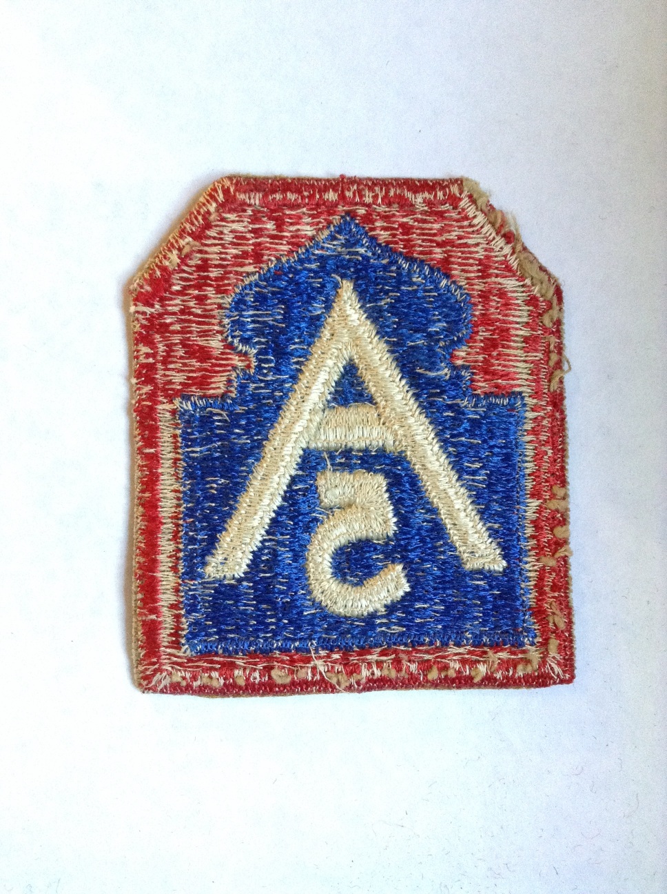 Red patch with white "A" over "5" on a blue mosque.