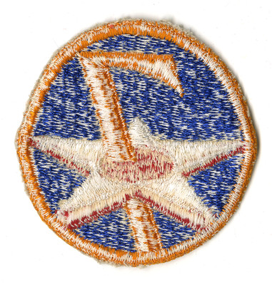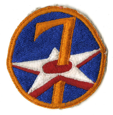 Thick, fully-embroidered white-back, gold-bordered patch with a gold "7" through a large red-centered and -bordered white star. White cut-edge.
