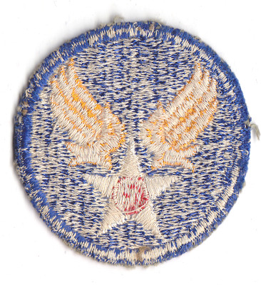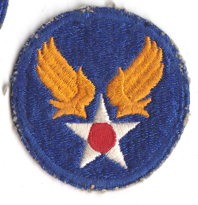 The "Hap Arnold Emblem", a blue-bordered blue disc with gold-winged white star with red center. Fully-embroidered white-back with thread remnants.