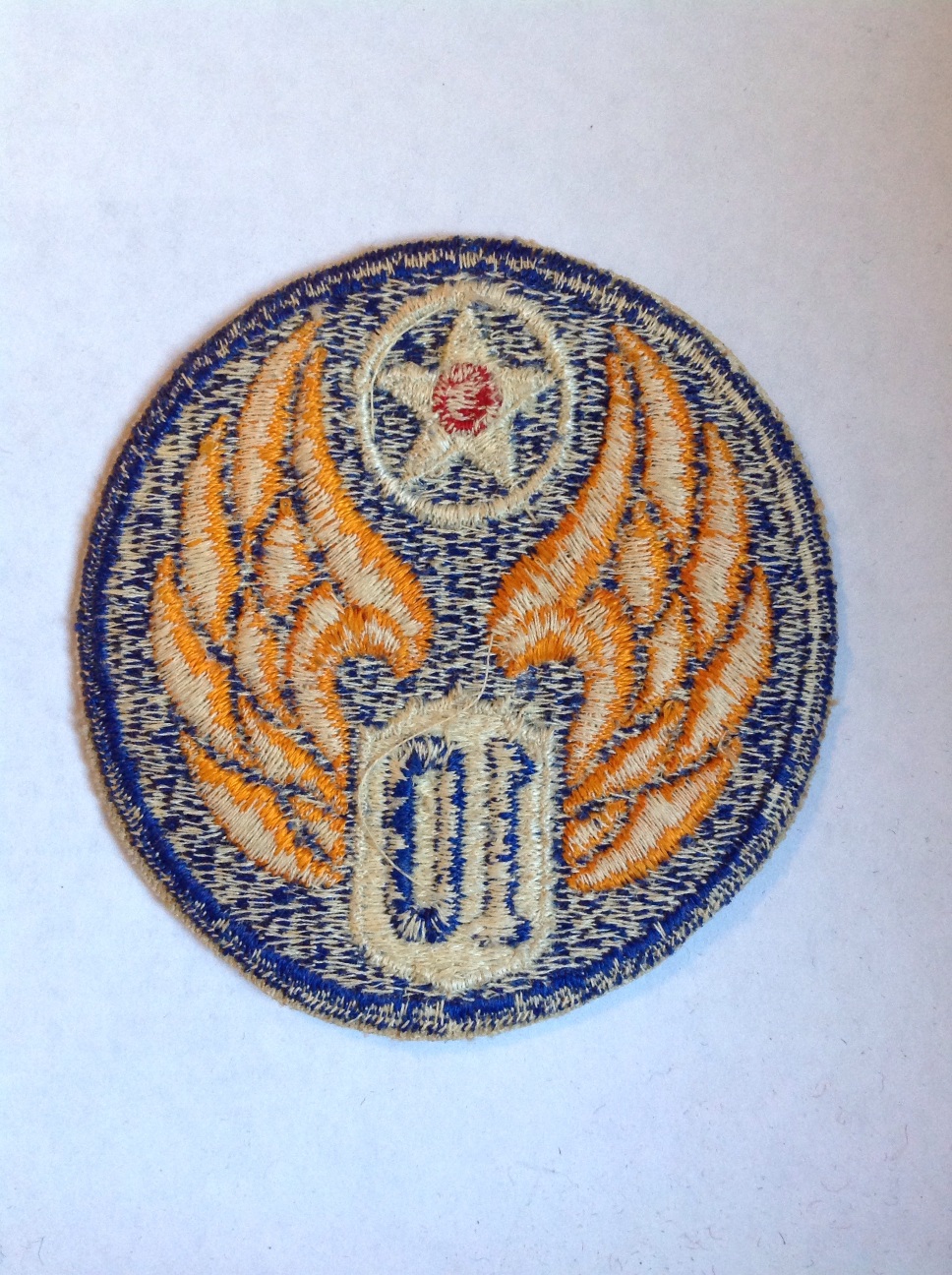 Shoulder sleeve insignia for the Tenth Air Force. A gold-winged white shield with blue "10" under a red-centered white star in a white ring.