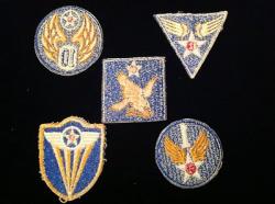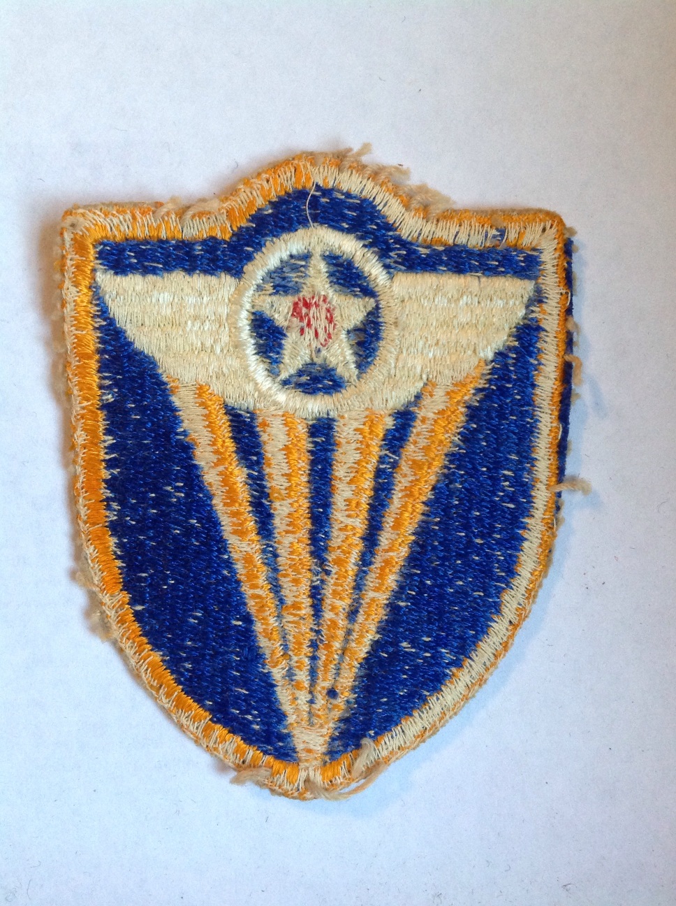 Shoulder sleeve insignia for the Fourth Air Force. A red-centered white star in a white-winged circle with four golden rays extending to a point below on a gold-bordered blue shield. Fully-embroidered, used, with white thread remnants.