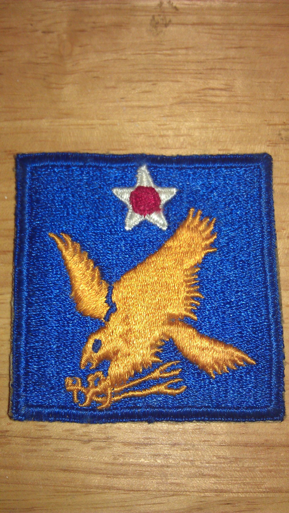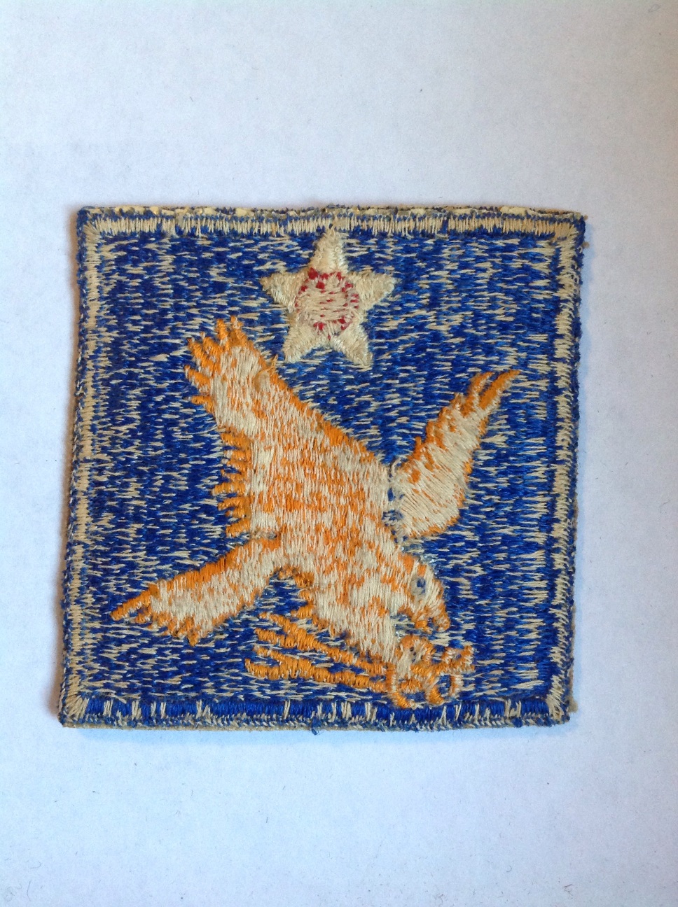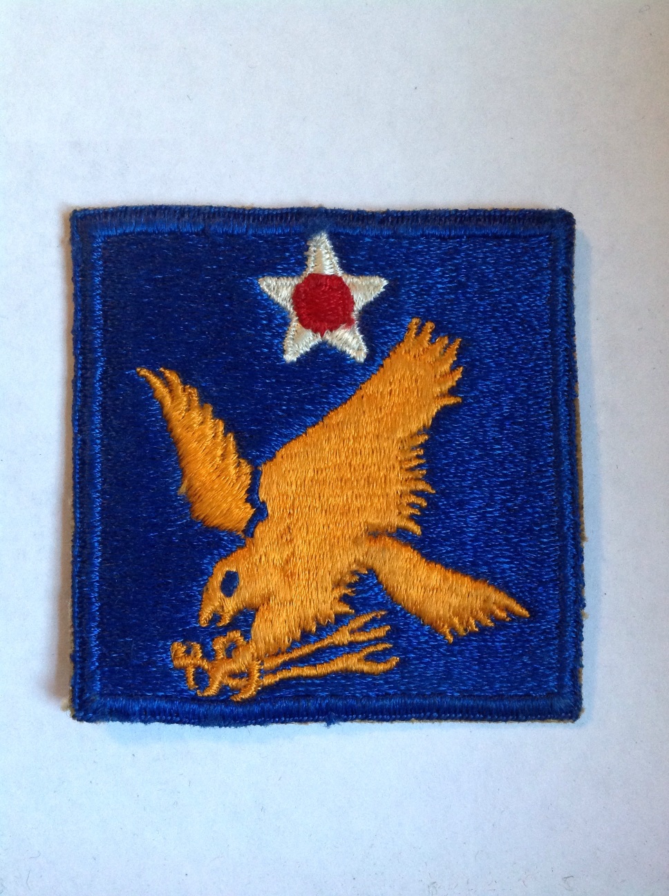 Shoulder sleeve insignia for the Second Air Force. A gold eagle under a white star with red center on a blue square background. Unused. Star does not extend into border as in other example.