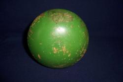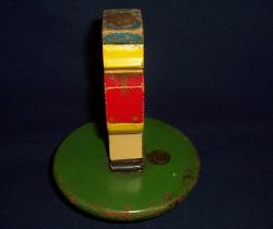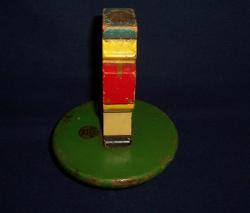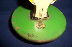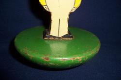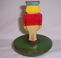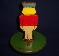 | Description | A 5" tall rocking/rocky toy consisting of a golden-haired boy in red tunic and blue hat, on a green round-bottom base with decal. One of a series of four (Clown, Bear, Boy, Cadet). See 1935 catalog, page 24. Does not appear in the 1934 catalog. See Holgate #1101 Rocky Toy, "Roro, The Clown". Wear to top and edges. Early "HOLGATE TOYS", "KANE, PA. U.S.A." decal (dt3) Base is 4" diameter, 1.25" tall. Cadet is .875" thick. |