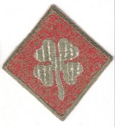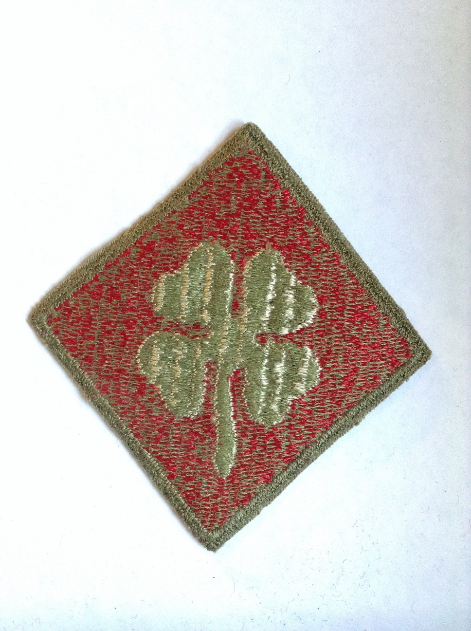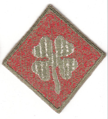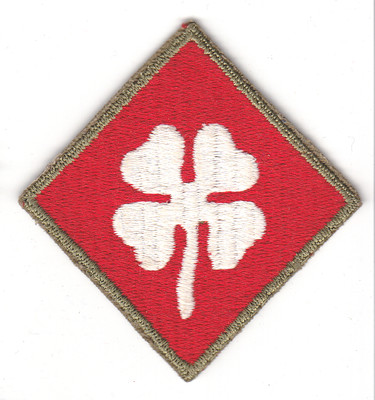 A white four-leaf clover on a red diamond with a green border. Fully embroidered, green back. Unused.