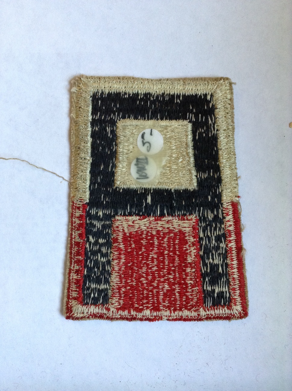 A white-over-red trapezoid with a large black block-A. Fully embroidered white-back on khaki. Small white paper circles ("5-" and "WWII") glued to back.