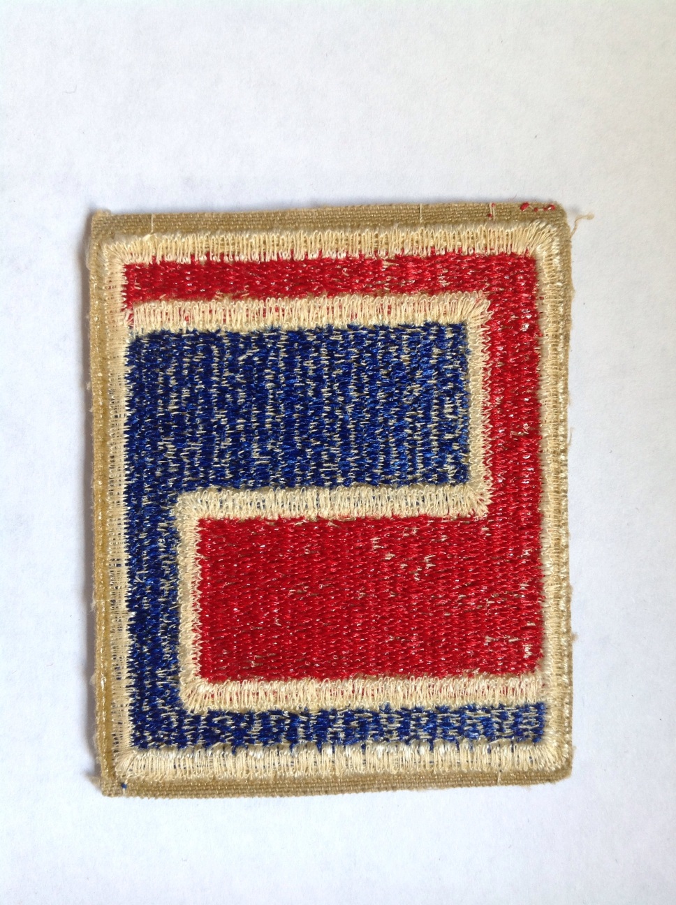 A red and blue rectangular figure 2 3/4 inches (6.99 cm) in height and 2 1/4 inches (5.72 cm) in width, all corners slightly rounded, the partition lines of which are in the form of a squared ogee of white 1/16 inch (.16 cm) in width all within a 1/8 inch (.32 cm) white border.