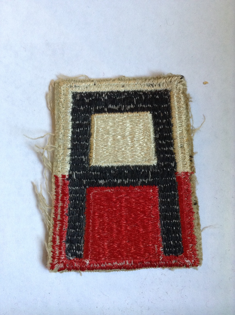 On a background equally divided horizontally white and red, 3 1/4 inches in height and 2 1/2 inches in width at base and 2 1/8 inches in width at top, a black block letter "A", 2 3/4 inches in height, 2 inches in width at base and 1 5/8 inches in width at top, all members 7/16 inch wide, all enclosed within a 1/8 inch Army Green border.