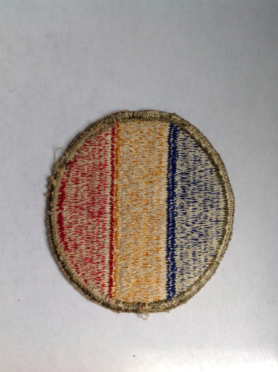 A disc 2 1/2 inches (6.35cm) in diameter overall consisting of three vertical stripes of equal width of blue, yellow and scarlet, the blue to the left, all within a 1/8 inch (.32cm) Army green border.
