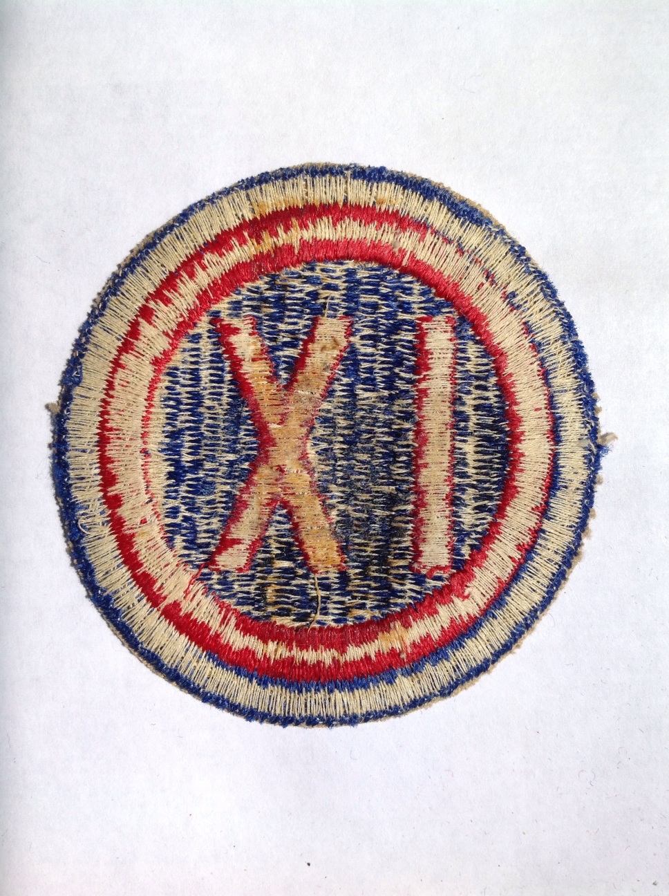 On a blue disc 2 13/16 inches (7.14 cm) in diameter the scarlet Roman numeral IX encircled by a scarlet annulet.