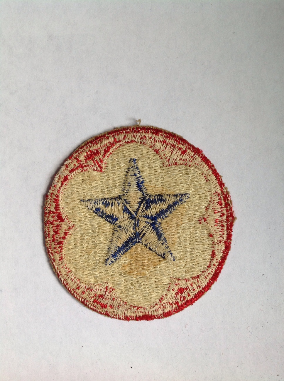 A blue five pointed star, one point up, 1 3/8 inches in diameter on a white background within a red border, outside diameter 2 1/4 inches, inside invected of six.